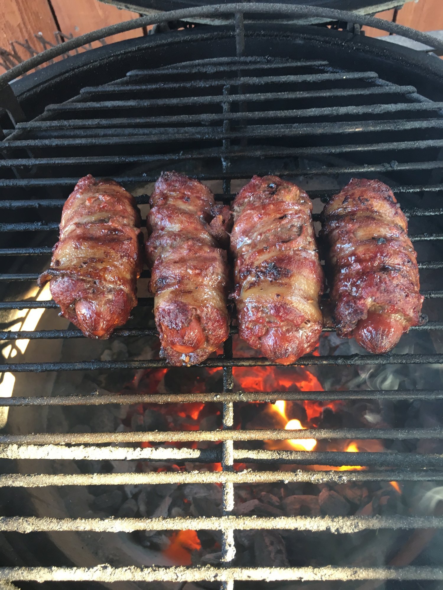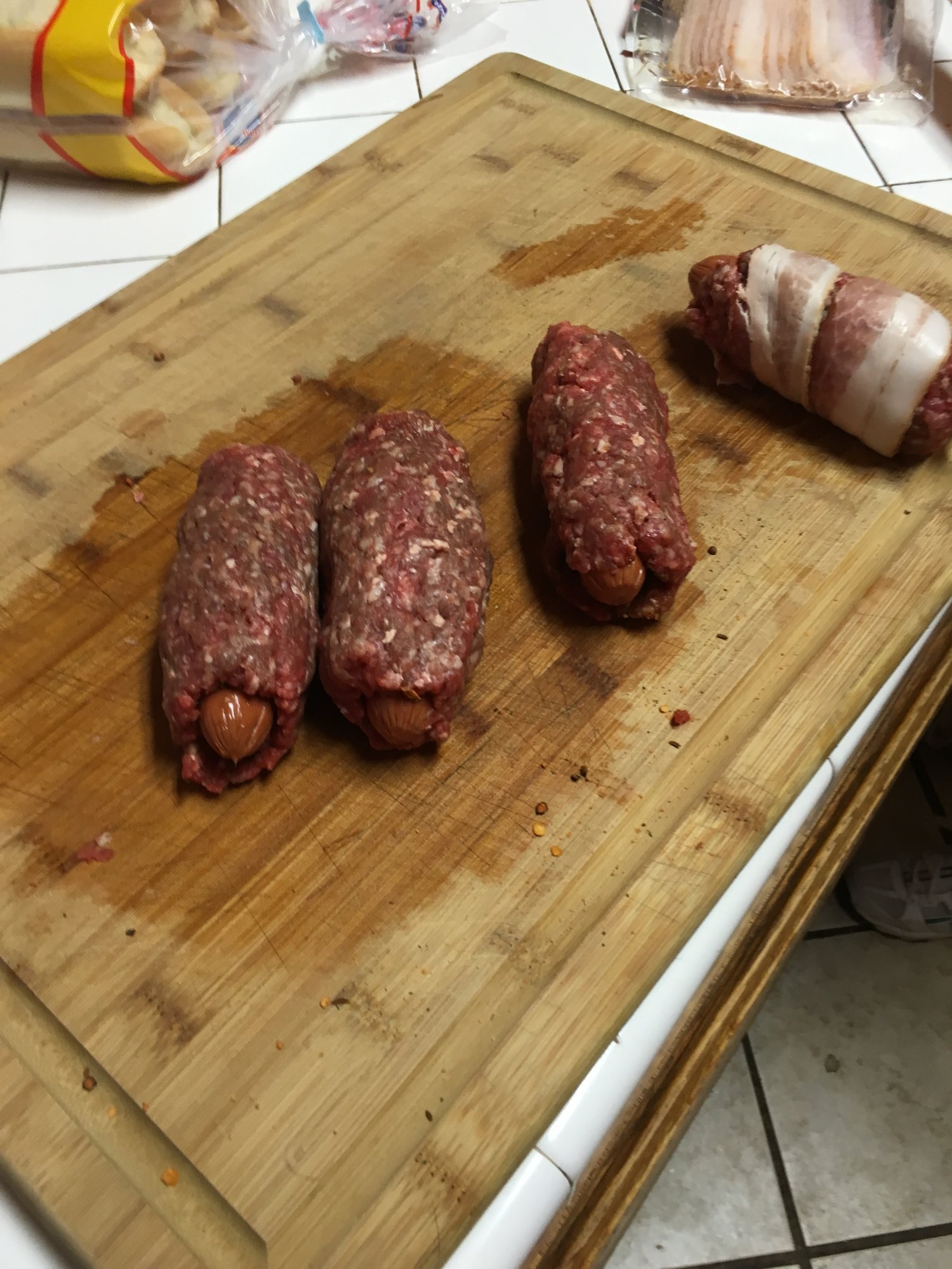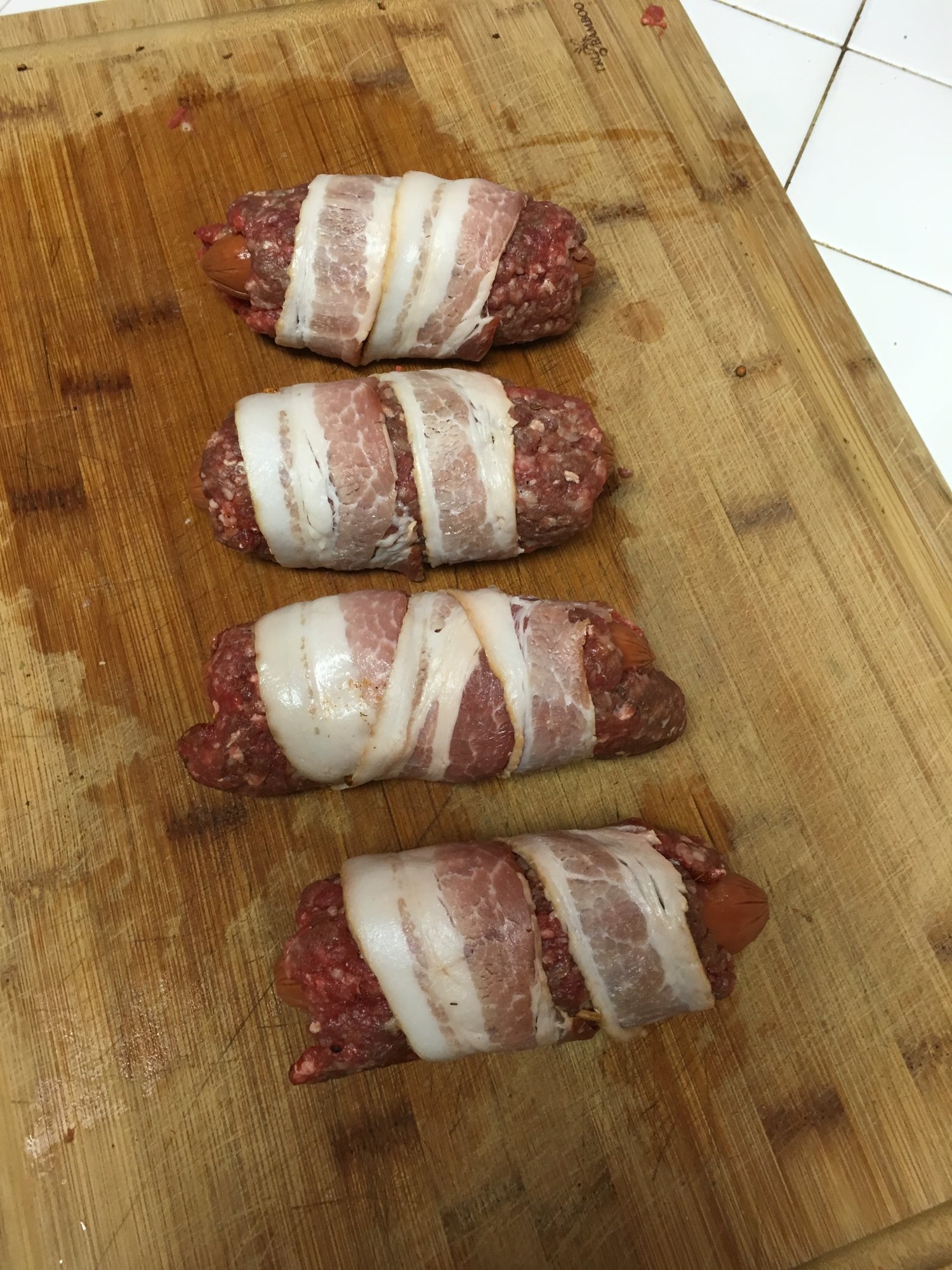 These are awesome! Hot Dog wrapped in ground beef wrapped in bacon. You can substitute any sausage you want for the hot dog. Going to do linguica next time. We put them in a hoagie roll, with whatever condiments you like. Possibilities are endless.Central Valley CA One large egg One chocolate lab "Halle" two chiuahuas "Skittles and PeeWee"