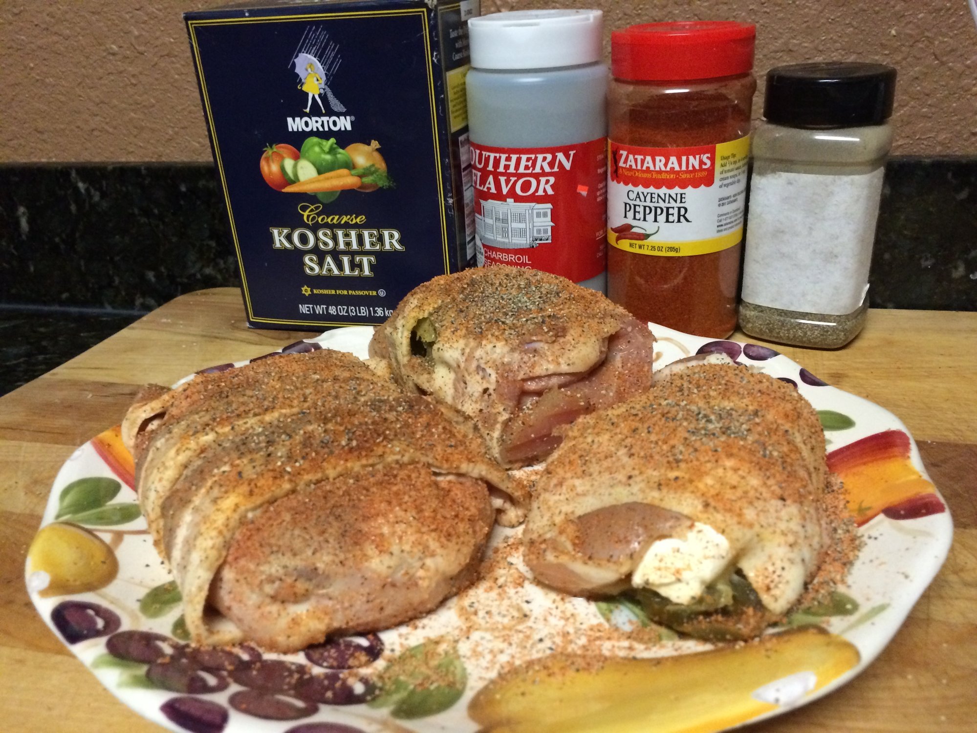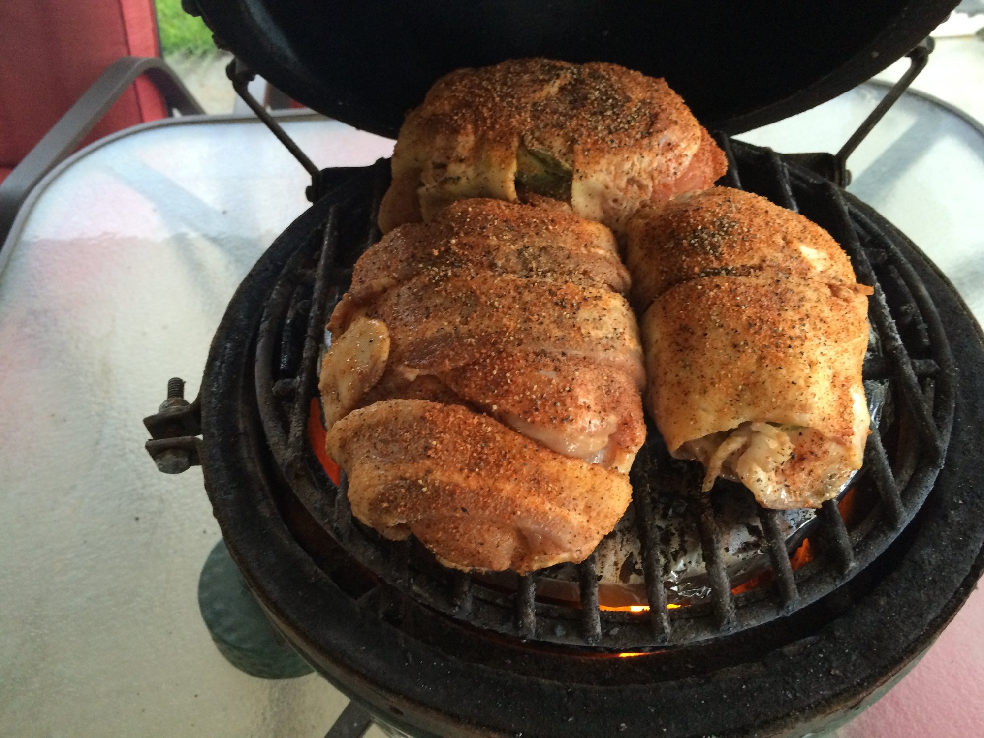 Nothing new or special here. This is some of the stuffed breasts and thighs that I have posted many times in the past. The only difference being the cooking temp. Due to time and foul weather, I ran these at 500 degrees until within 6 degrees of my target temp. I then bumped to 600 degrees for the finish. The high heat worked great on the bacon.