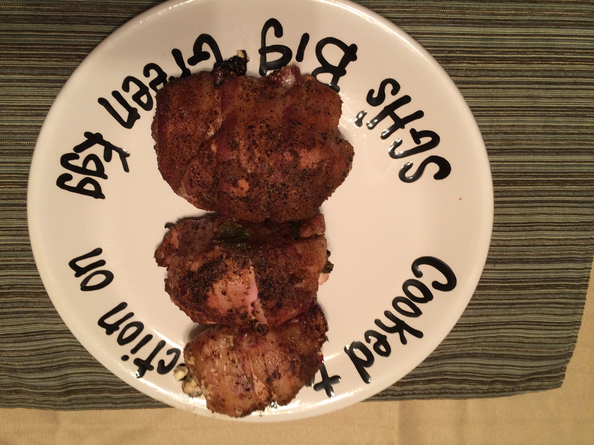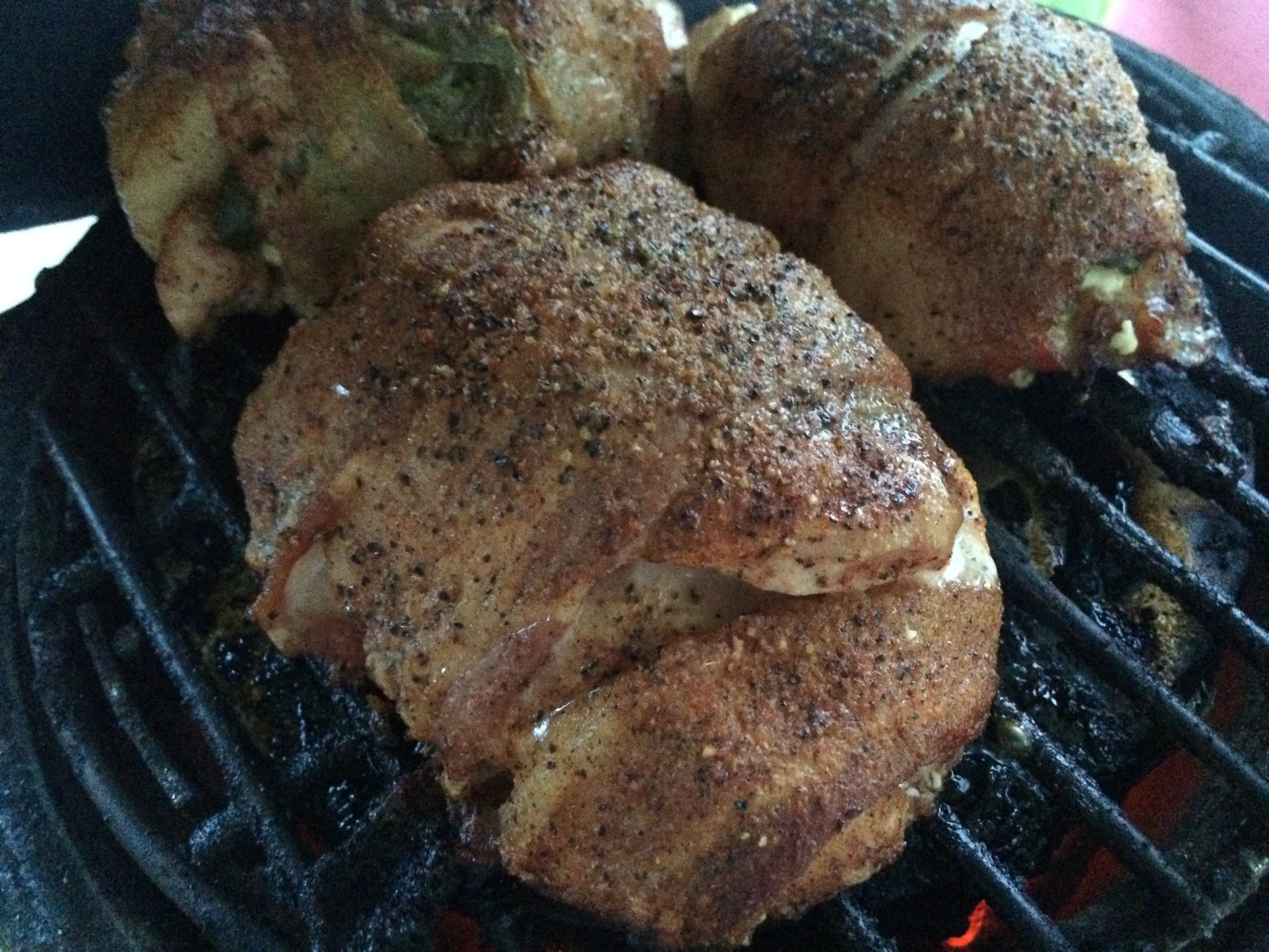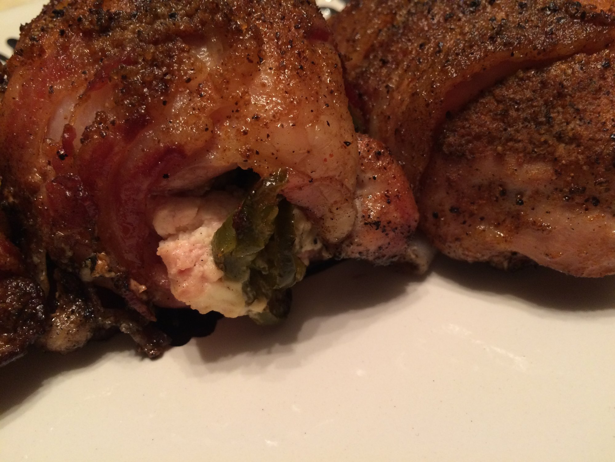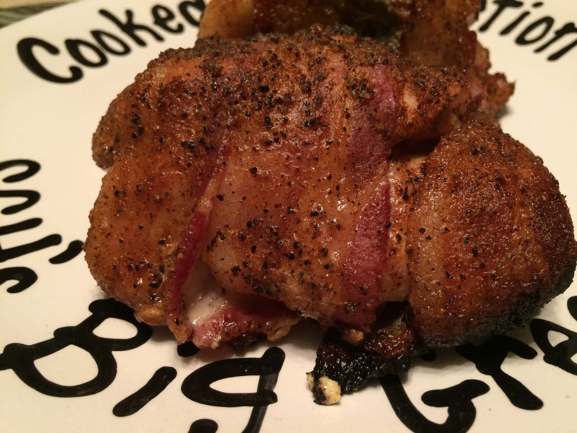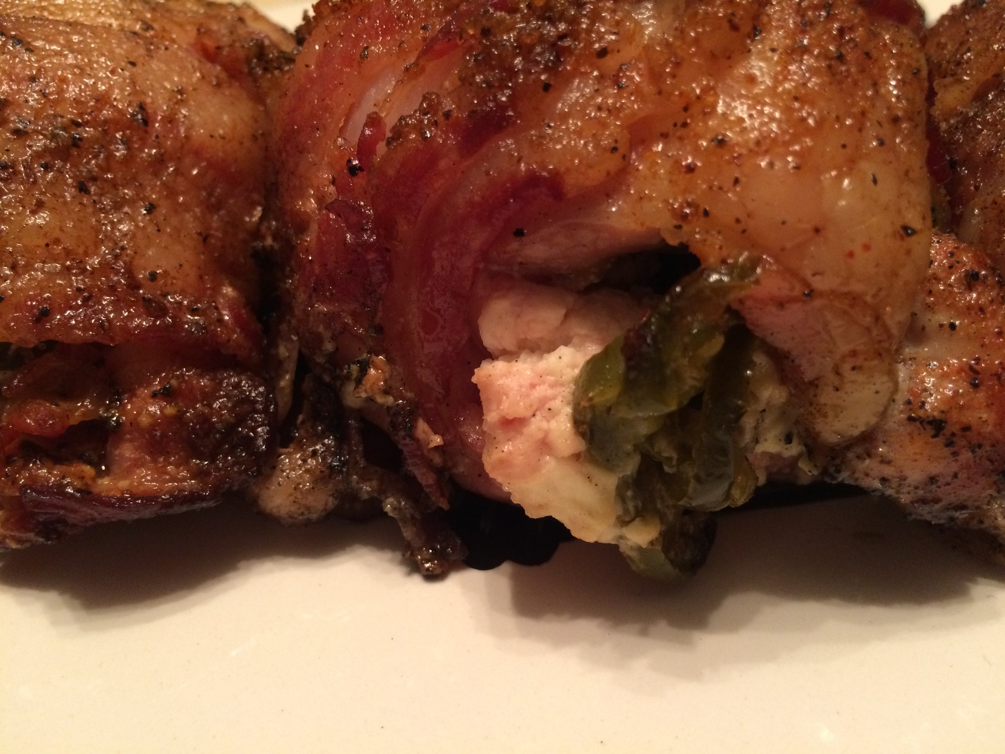 Thighs and breasts stuffed with spinach, pineapple, cream cheese and jibbled up bacon. Then wrapped with bacon.