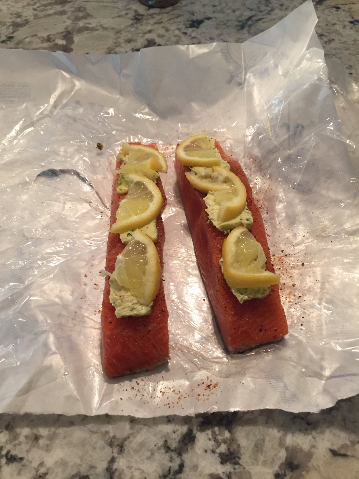 The beauty of Kerry Gold butter - not only EU style but they also sell a compounded version with garlic and herbs.  Was great on the salmon.