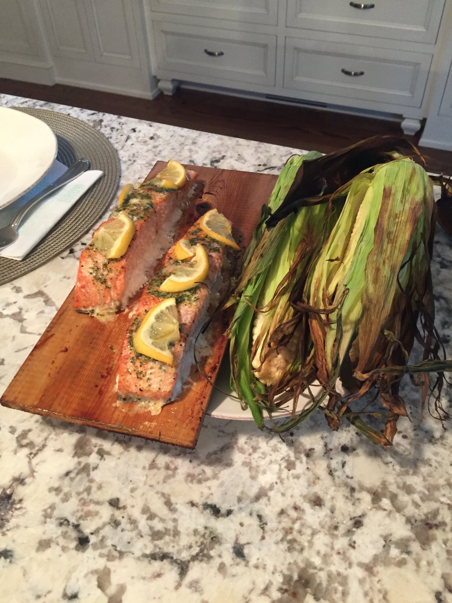 Local (Lancaster county PA) grass fed beef, reverse sear - sea salt, ground pepper, and a touch of granulated garlic. Cedar plank wild salmon - Kerry Gold garlic herb butter under the lemon slices and local white corn.