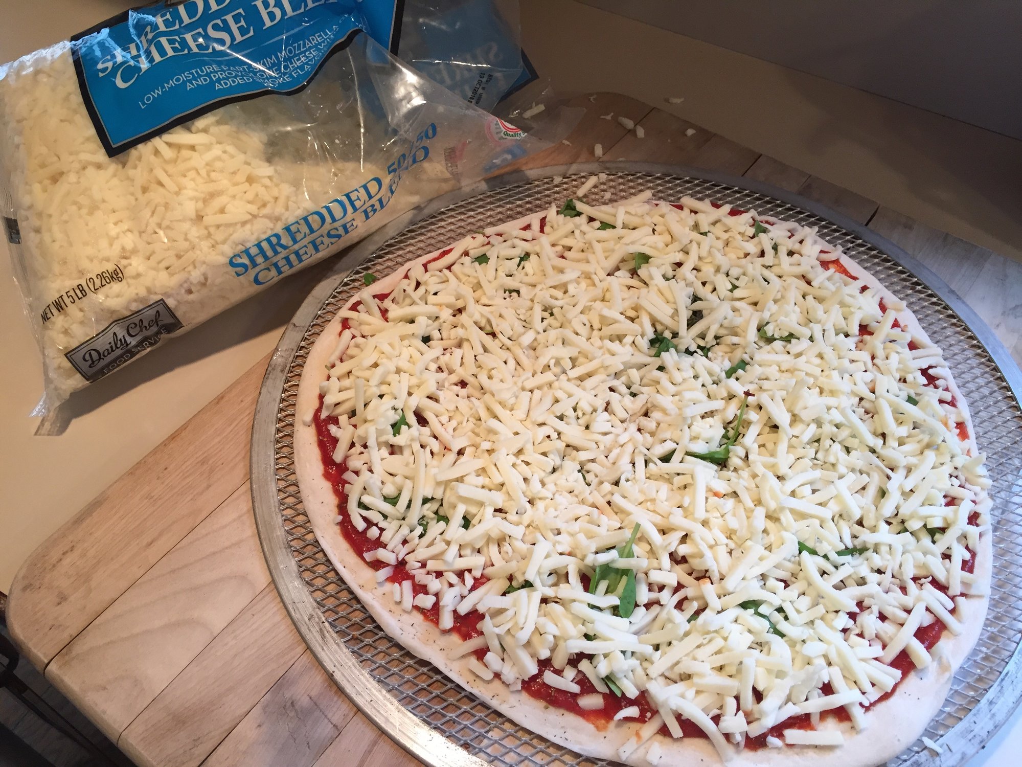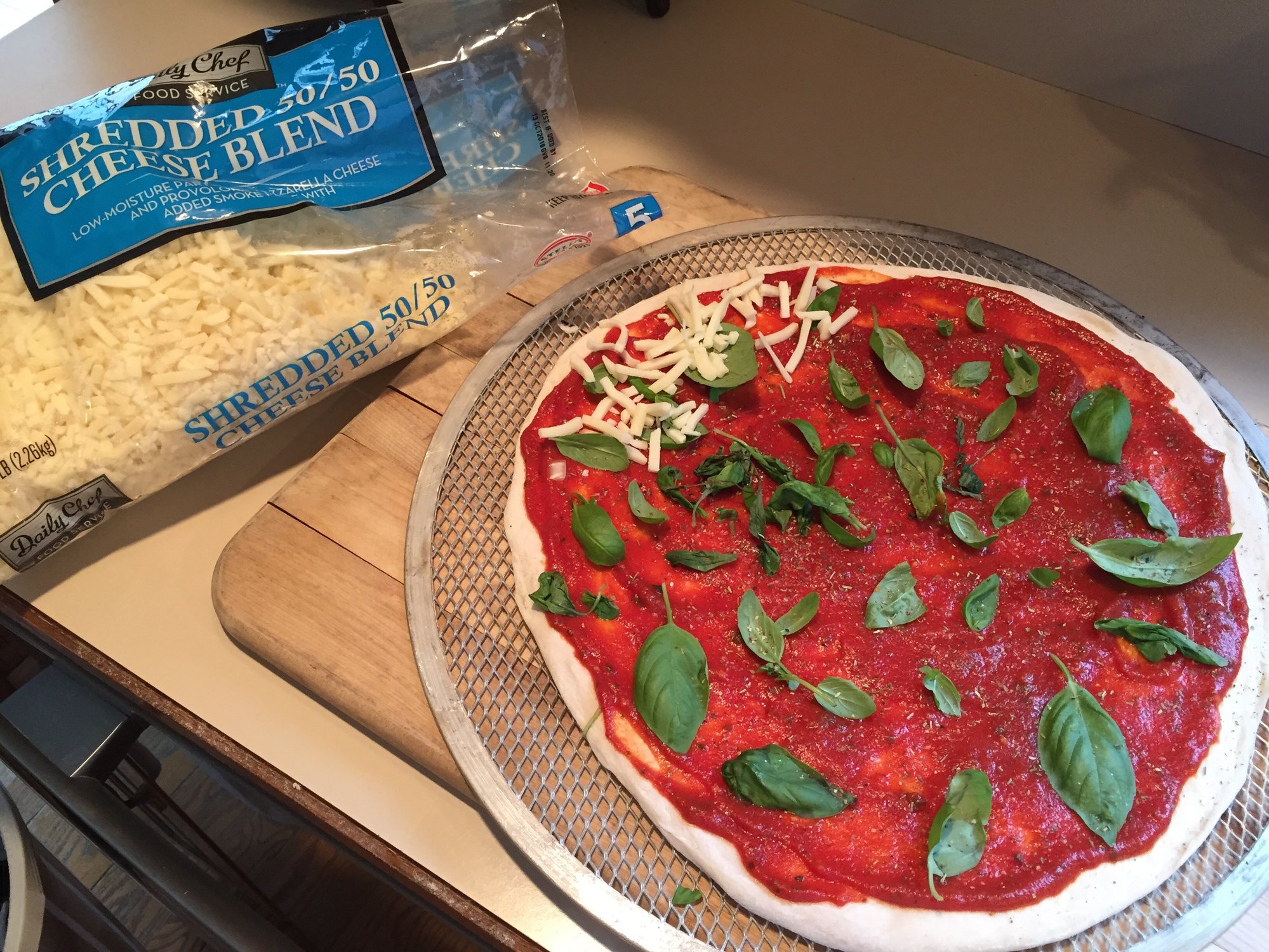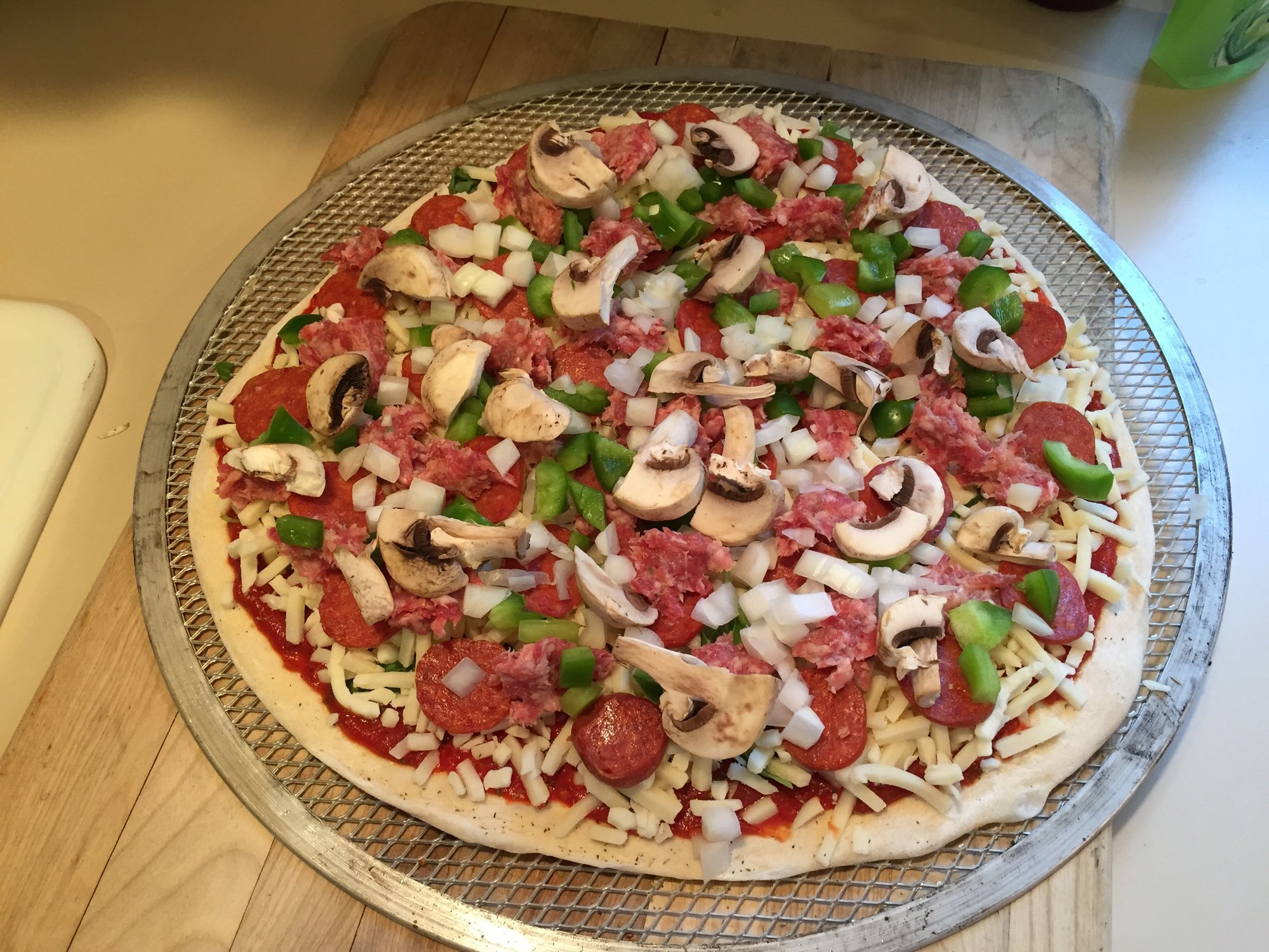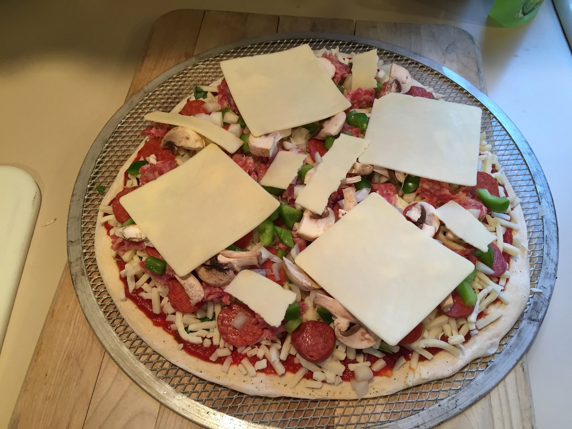 Made this one for me, Mids pizza sauce, basil, 50/50 Motts/Provalone, pepperoni, sausage, green peppers, onions, mushrooms and cheddar cheese. It tasted great!