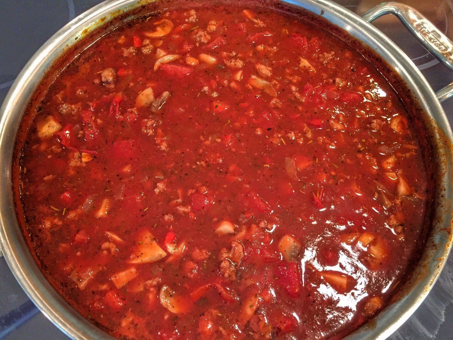 Started out with the sauce. Ground Turkey, onions, red peppers, shrooms, diced tomatoes, tomato sauce and red wine