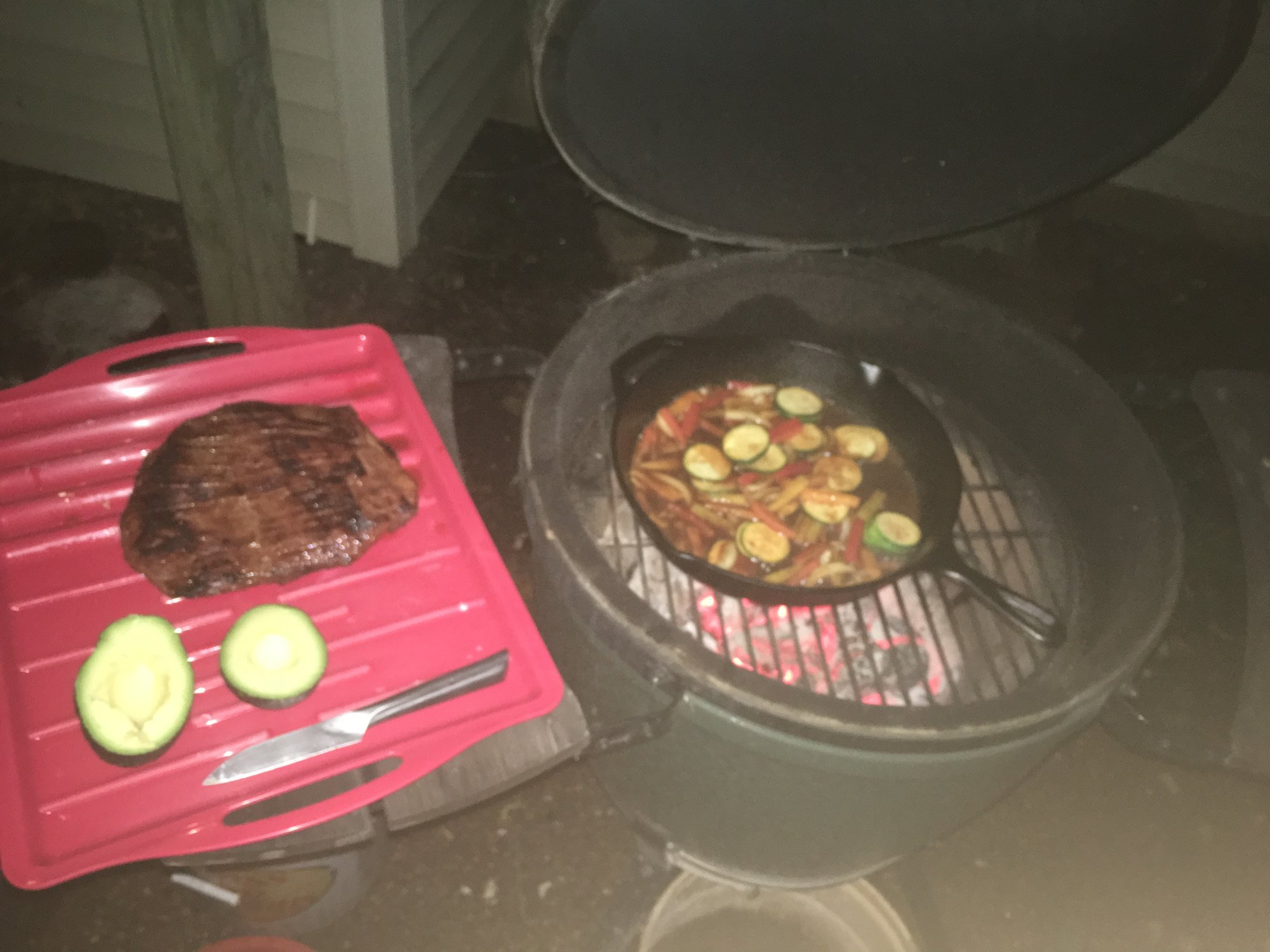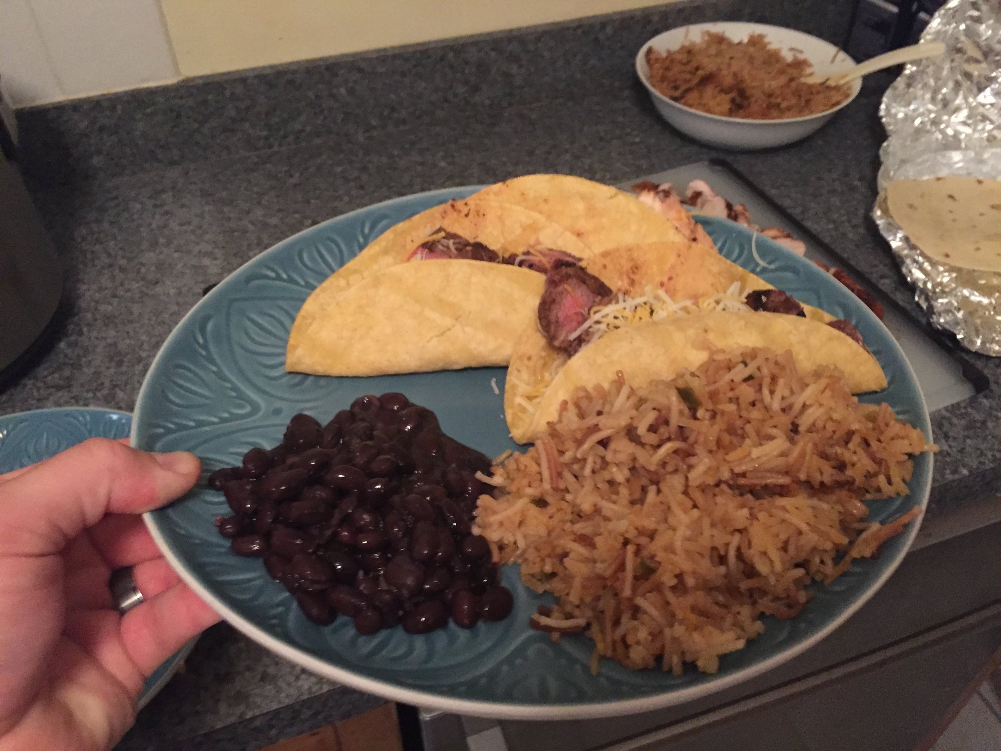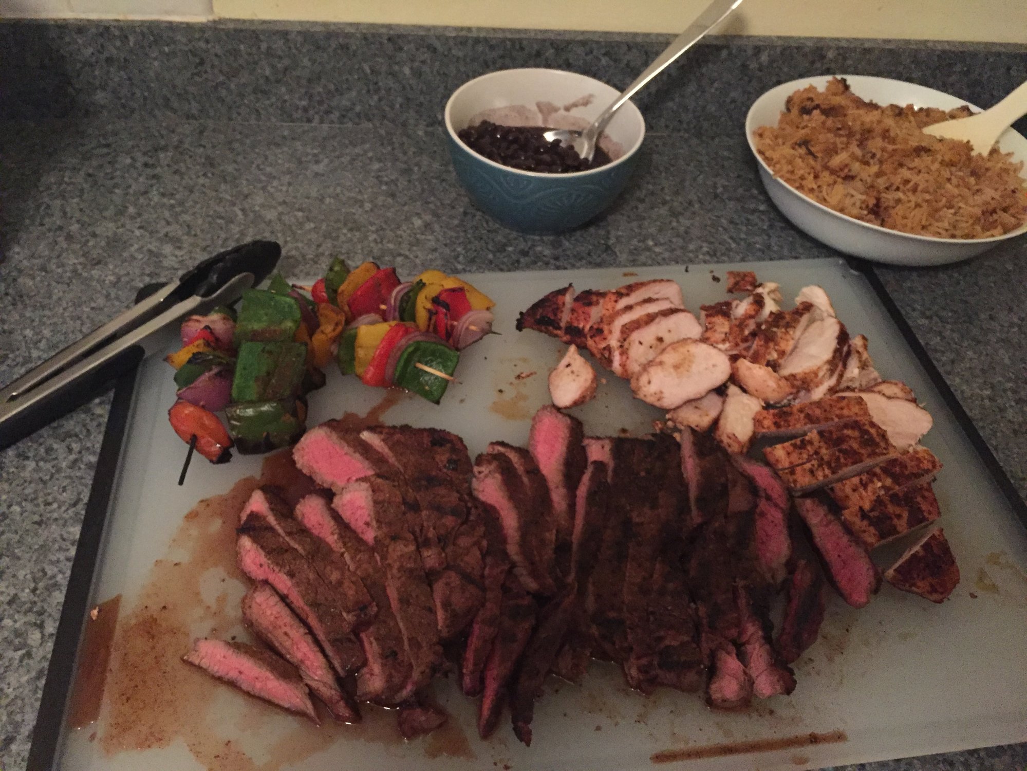 Steak and Chicken grilled up and served with onions, peppers, tomatoes, rice and beans.