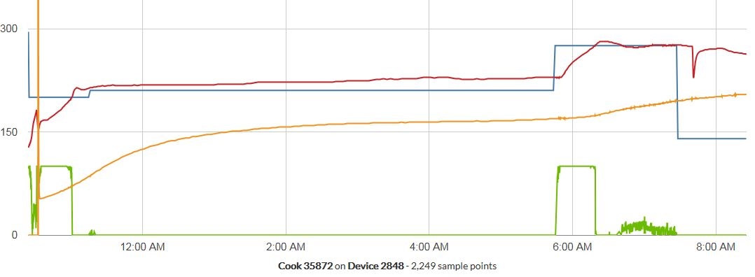 Here's an example of why I like my controller. Wife decided Saturday night that she wanted to take pulled pork to a friend's for lunch. had to be ready by 10 AM Sunday. No way I'm staying up all night, and a bit tight for turbo. Light a small fire, install the blower, and the temp wants to run around 215. So I set the blower for 210. I know that the butts will stall during the night, cooking at that temp. 5:45 I wake up, turn on my phone, set the temp to 275, fall back asleep for a bit, and the butts finish around 7:30 and I take them off around 8:30. And here's a chart for @jeepster47 since he likes them.