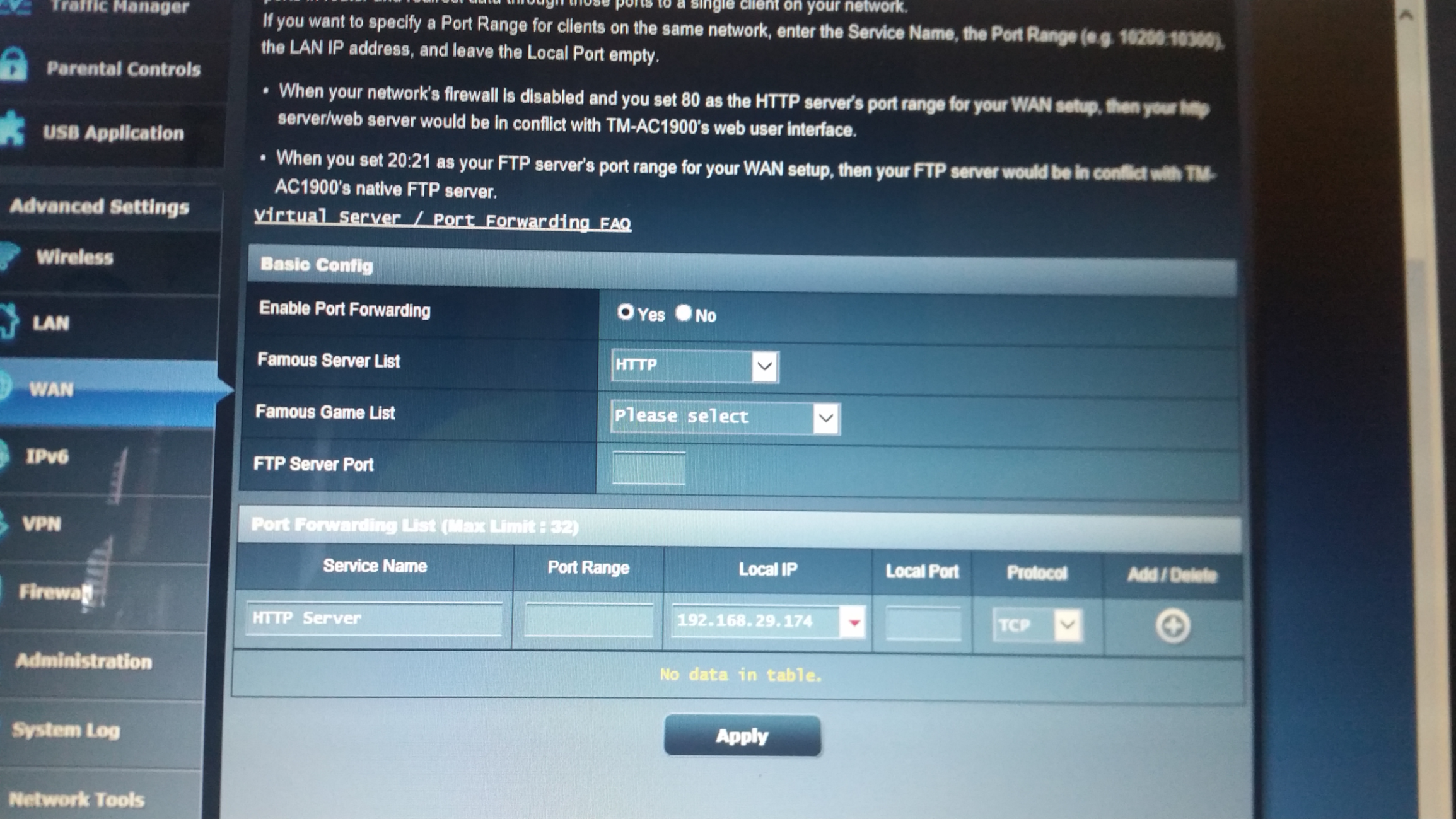 @4Runner Thank you! I think Hotch might have pointed me in the right direction. I don't believe my router ip address is static. It sounds like you can't port anything without it being static first?