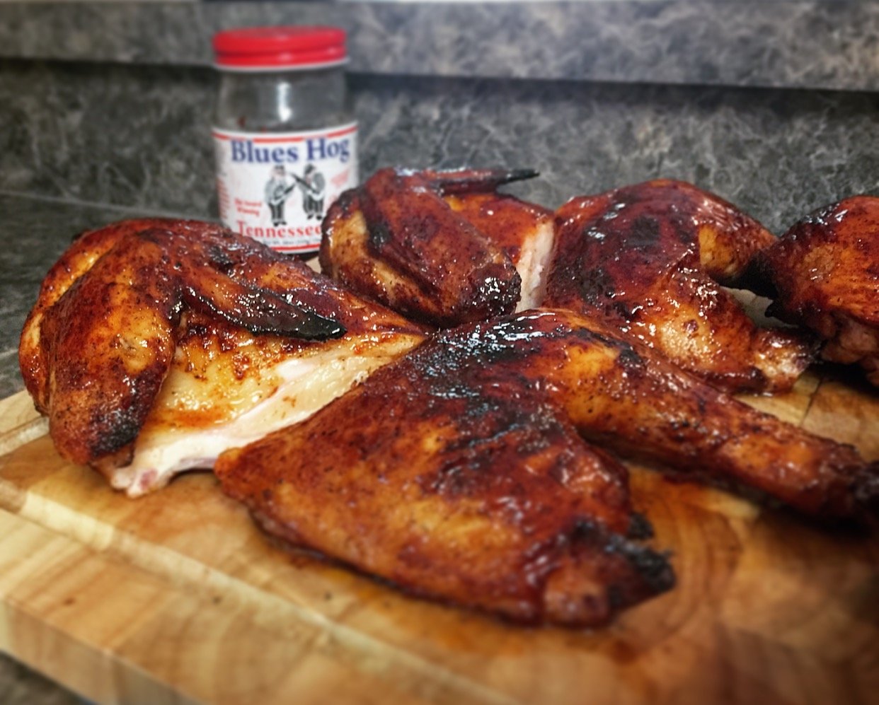 Olive Smoked Chickens w/ Blues Hog Tennessee Red