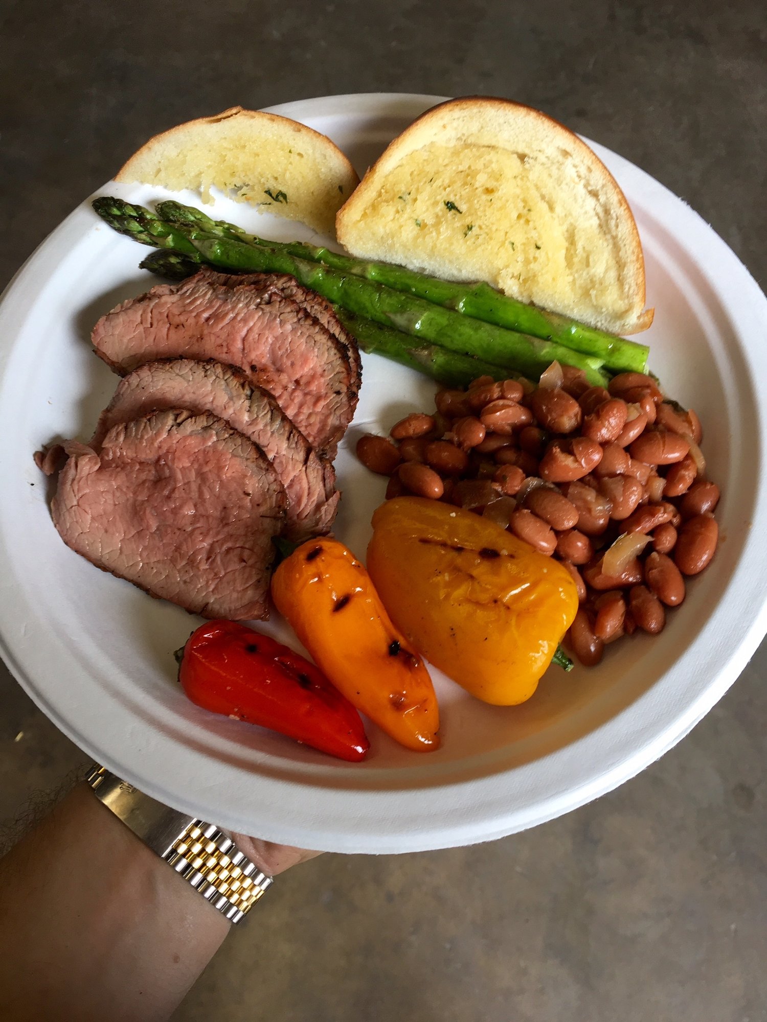Decided to cook for the guys at work. Brought the MiniMax to the warehouse and set it up for direct grilling at 500. Seared the tri-tip for about 4 minutes per side then dialed the MM down to 350 with the plate setter and let the meat cook to 130 degrees internal temp. Grilled some asparagus and little peppers while the meat rested. Picked up some garlic bread and Shiner Bock borracho beans from our local H-E-B in Houston Texas. All done in about an hour and we definitely had some happy folks around here. Can't wait to try it again.