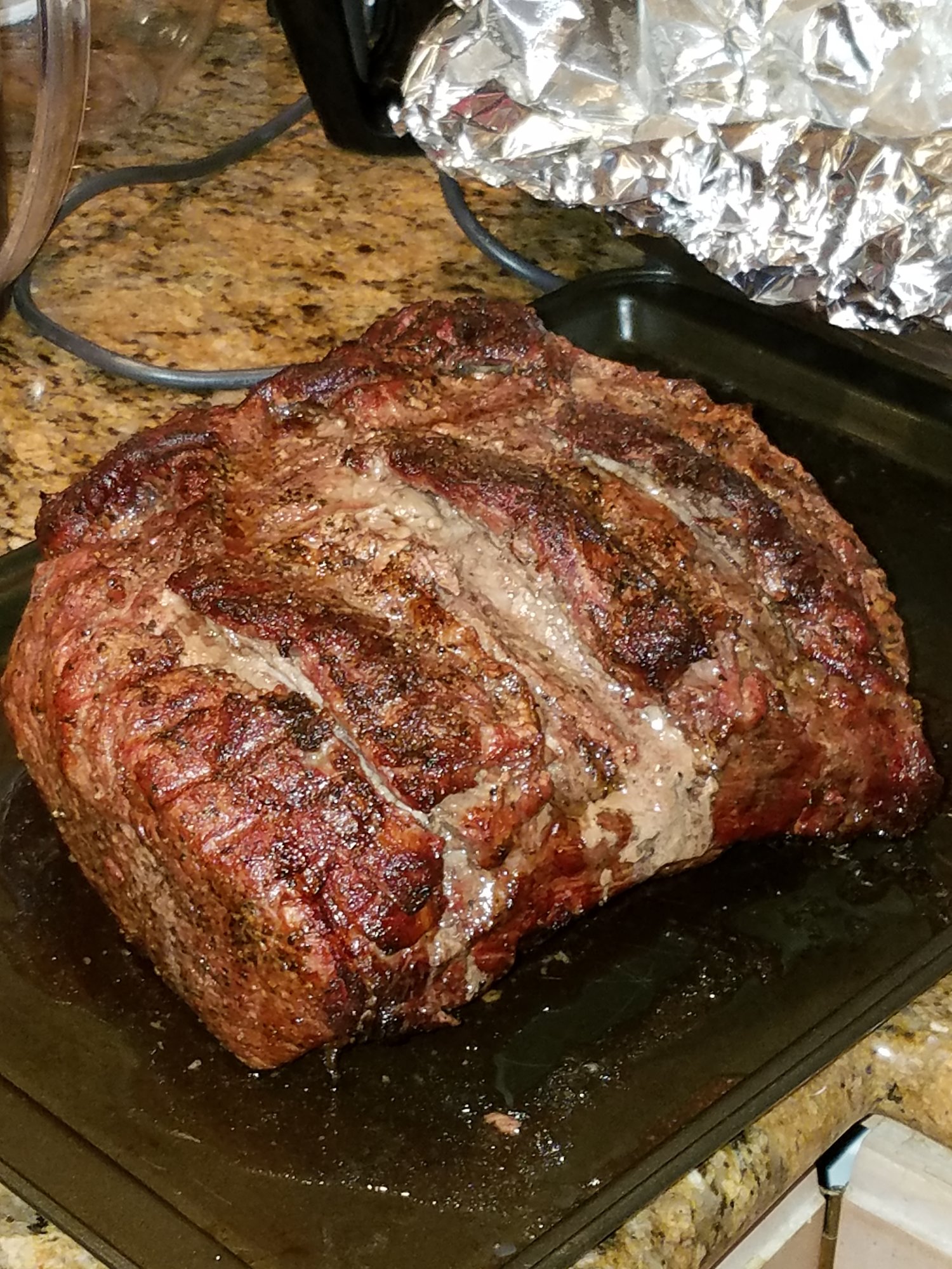 At 11am this morning my lovely wife informed me that she had invited her parents over for dinner. I had been thinking about doing a prime rib for the past few months, and figured that this was the perfect chance to try one. I kept the seasonings very basic, just salt and pepper after a coat of olive oil. Cooked it indirect at 250° until it reached 123°. While it was resting I jacked the egg upper to 500°. I seared both sides for 10 mins each and both ends for 5 mins. This is the best thing I have had off an egg!