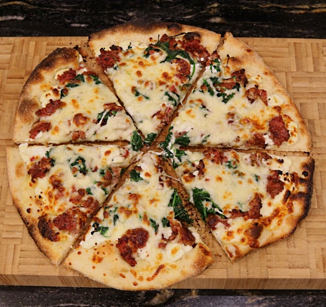 The pizza had Moroccan lamb sausage, goat's cheese and spinach toppings with some extra mozzarella added for good measure. Details of how I made it available here.