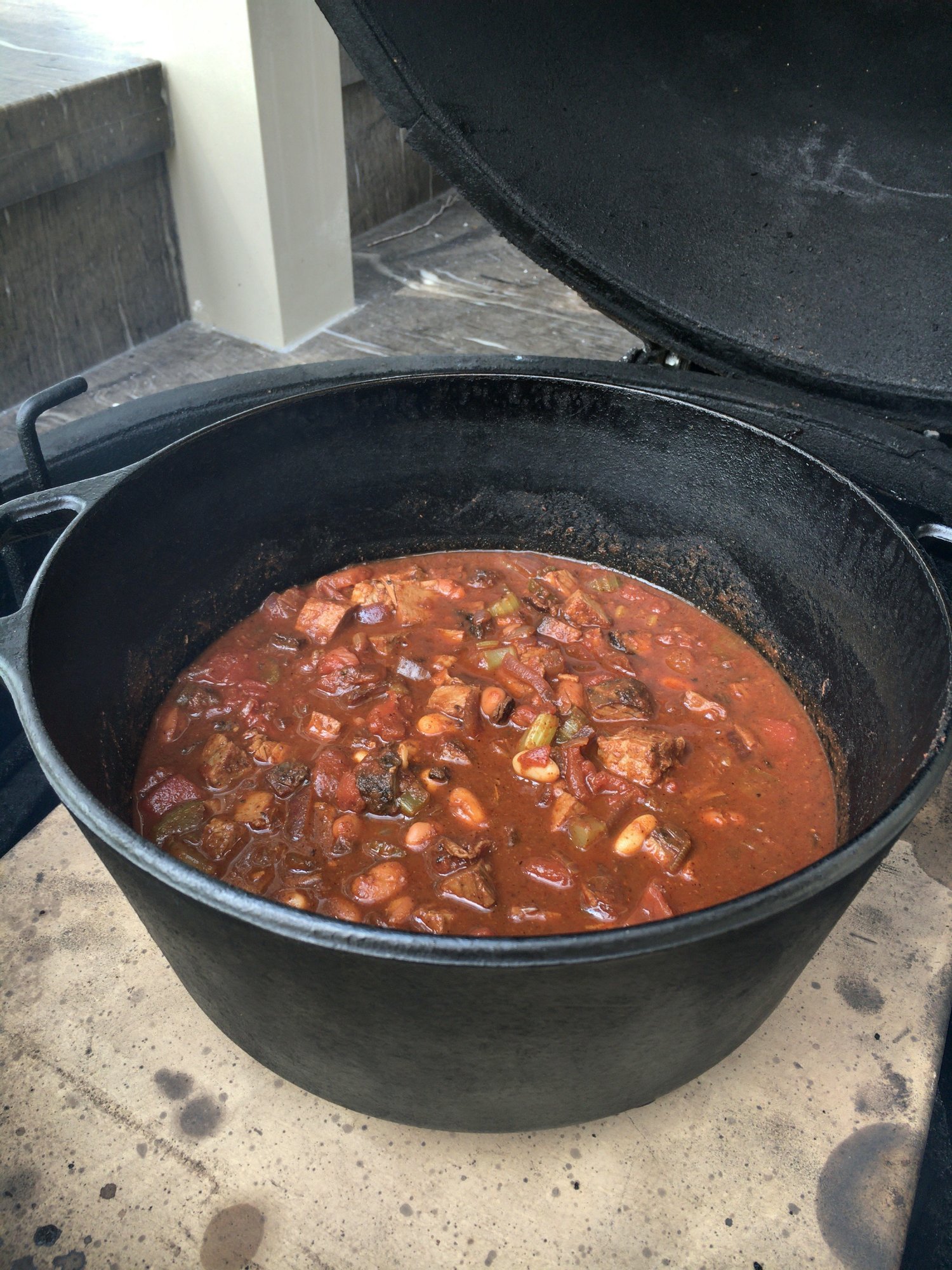 Ground beef, sweet and hot Italian sausage, chicken stock, jalapenos, tomatoes and tomato paste, bell pepper, onions, and a generous shake of about six different spices. Into the CI dutch oven at about 350 dome temp. Gonna add roasted corn towards the end. Planning to make a spicy cornbread to serve it over.