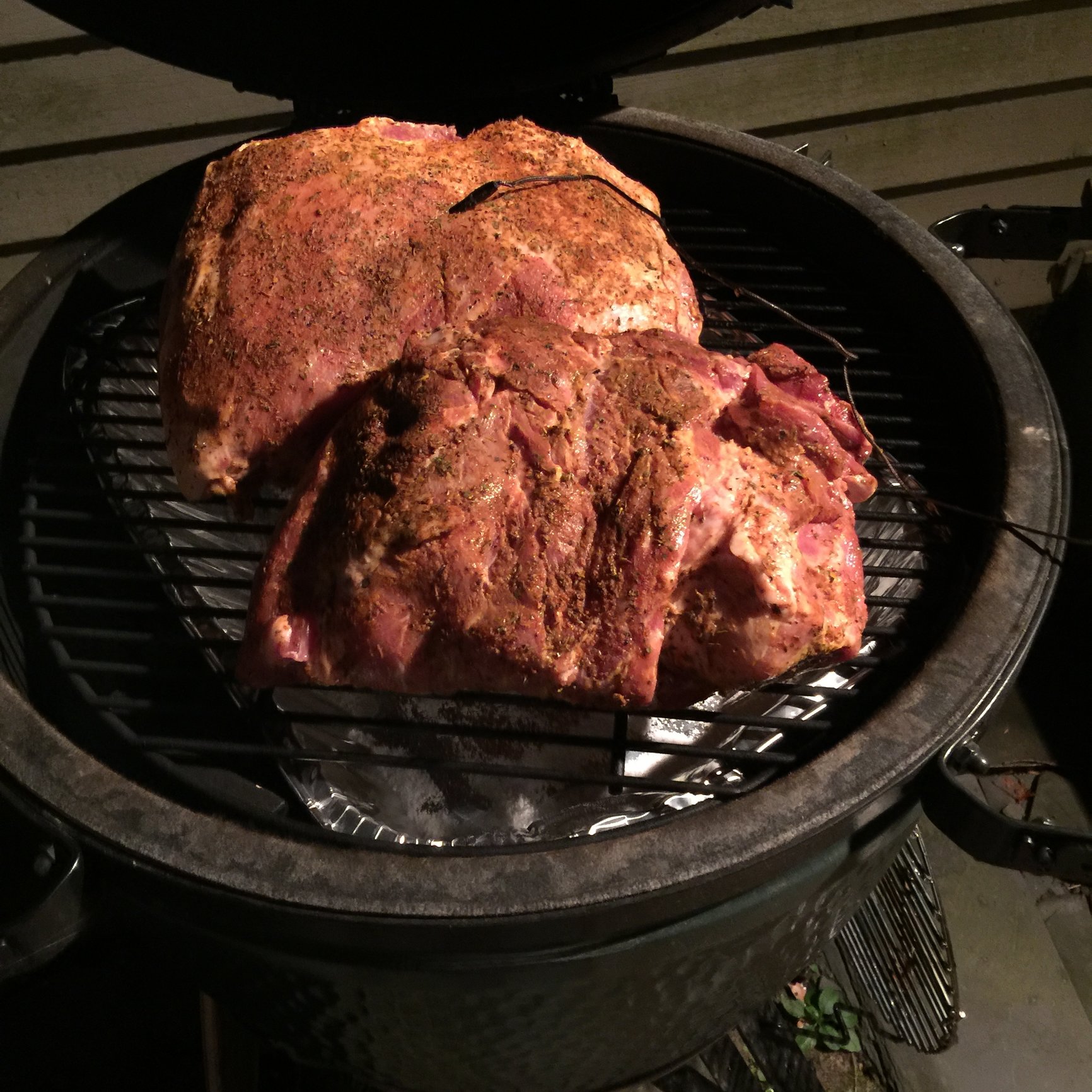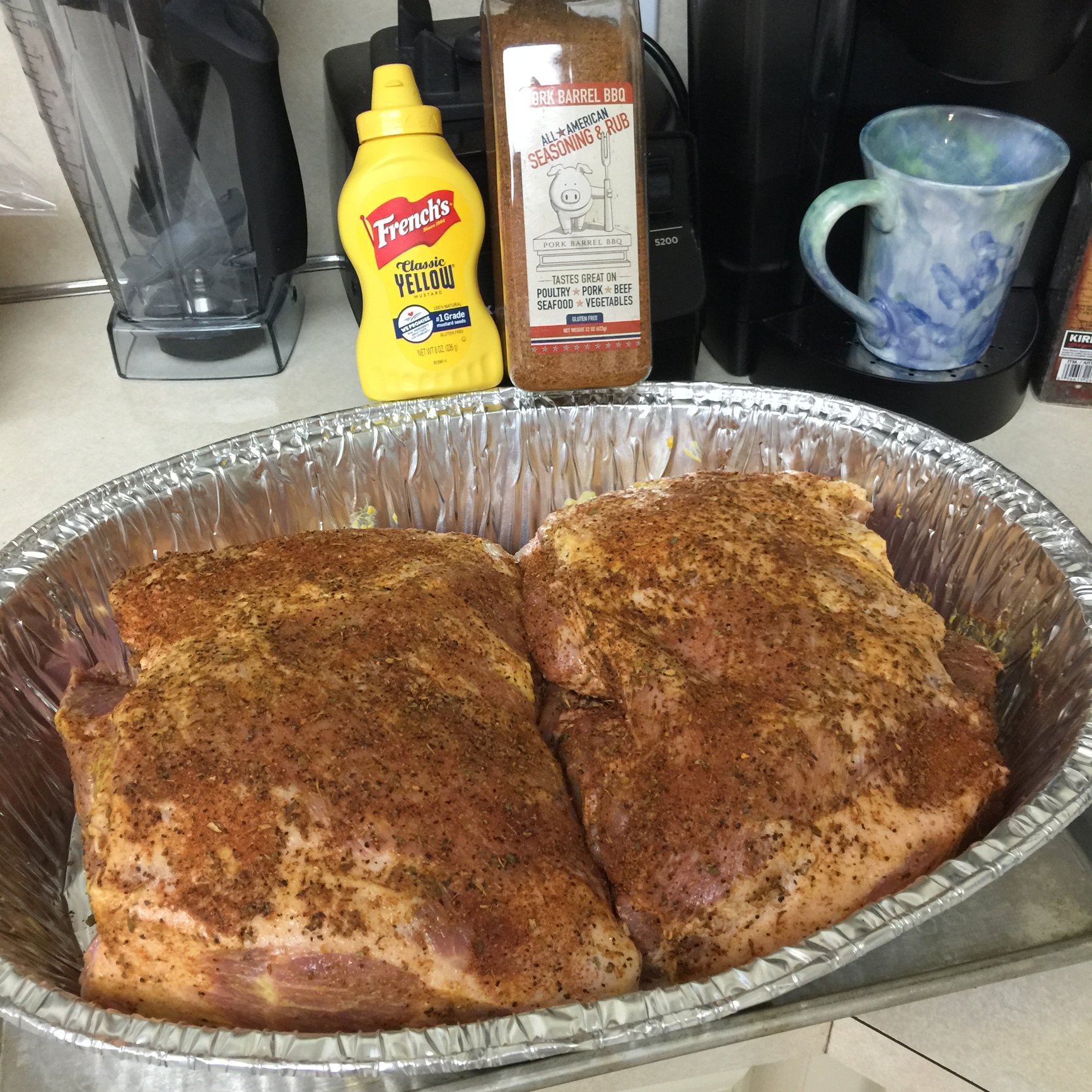 Double pack of boneless pork shoulder from Costco. Rubbed with mustard and seasoning from Pork Barrel BBQ (also from Costco).