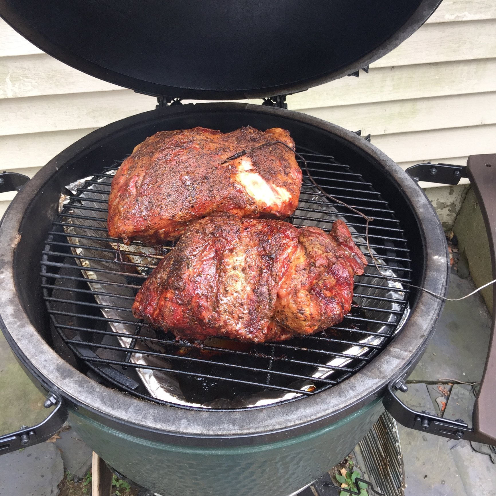 Dome temp is 225 and the butts are already at 150 degrees only four hours into it.  I'm going to try and keep it low and finish them as late as I can, as don't have a nice cooler. Maybe I need a Yeti? Haha the wife almost killed me when I woke up at 4 this morning, banging around the kitchen... Don't think she'll let me get one of those any time soon.