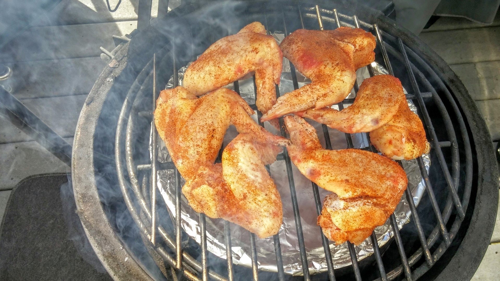 Been in the fridge uncovered since Friday night to dry the skin out. Rubbed with Mad Hunky Hot Whang and then on the small egg indirect around 275* to start. Rockwood lump with pecan chips for smoke.