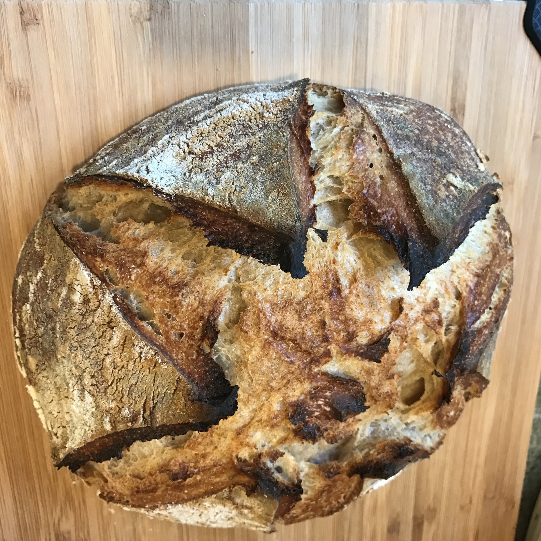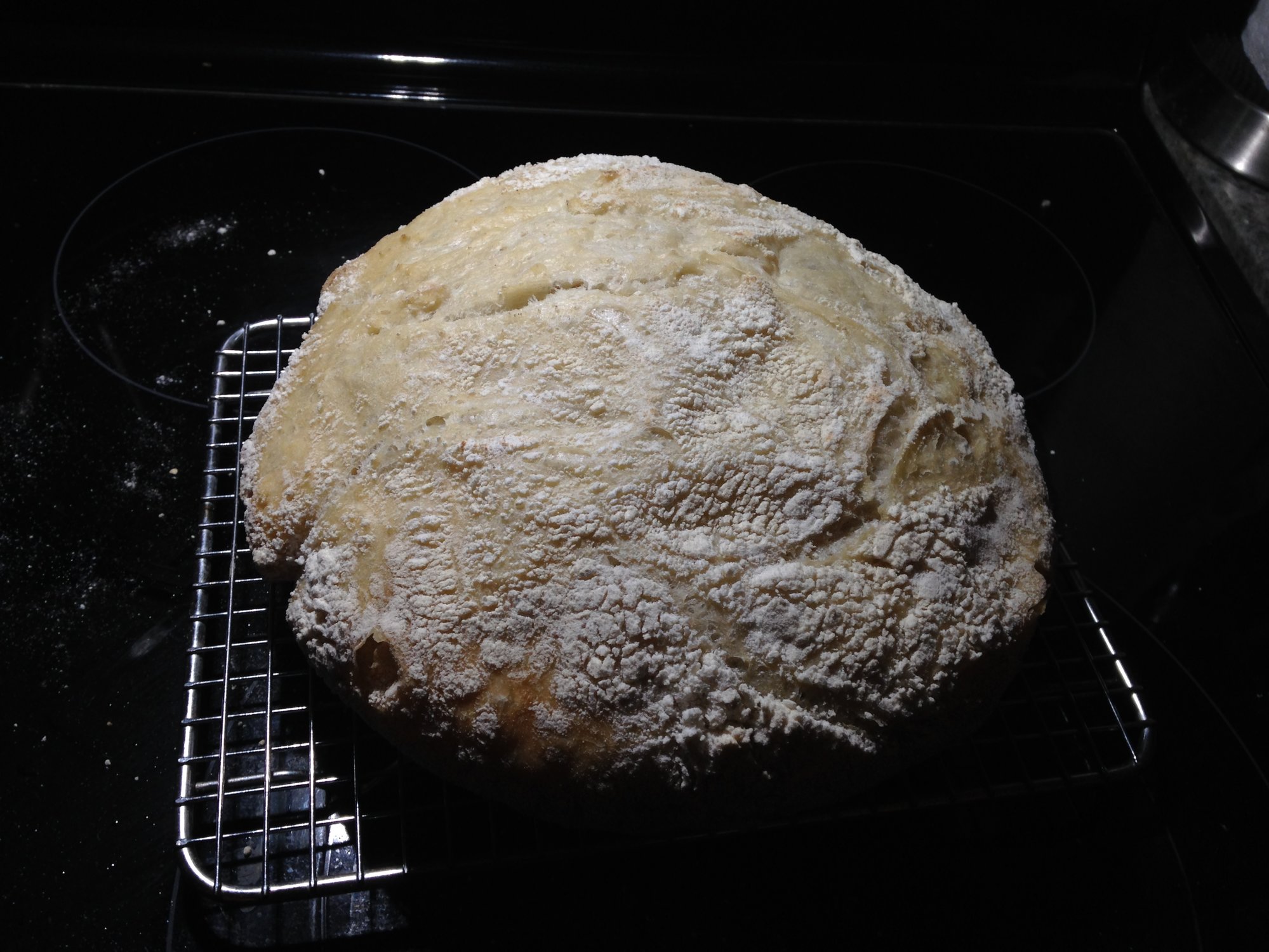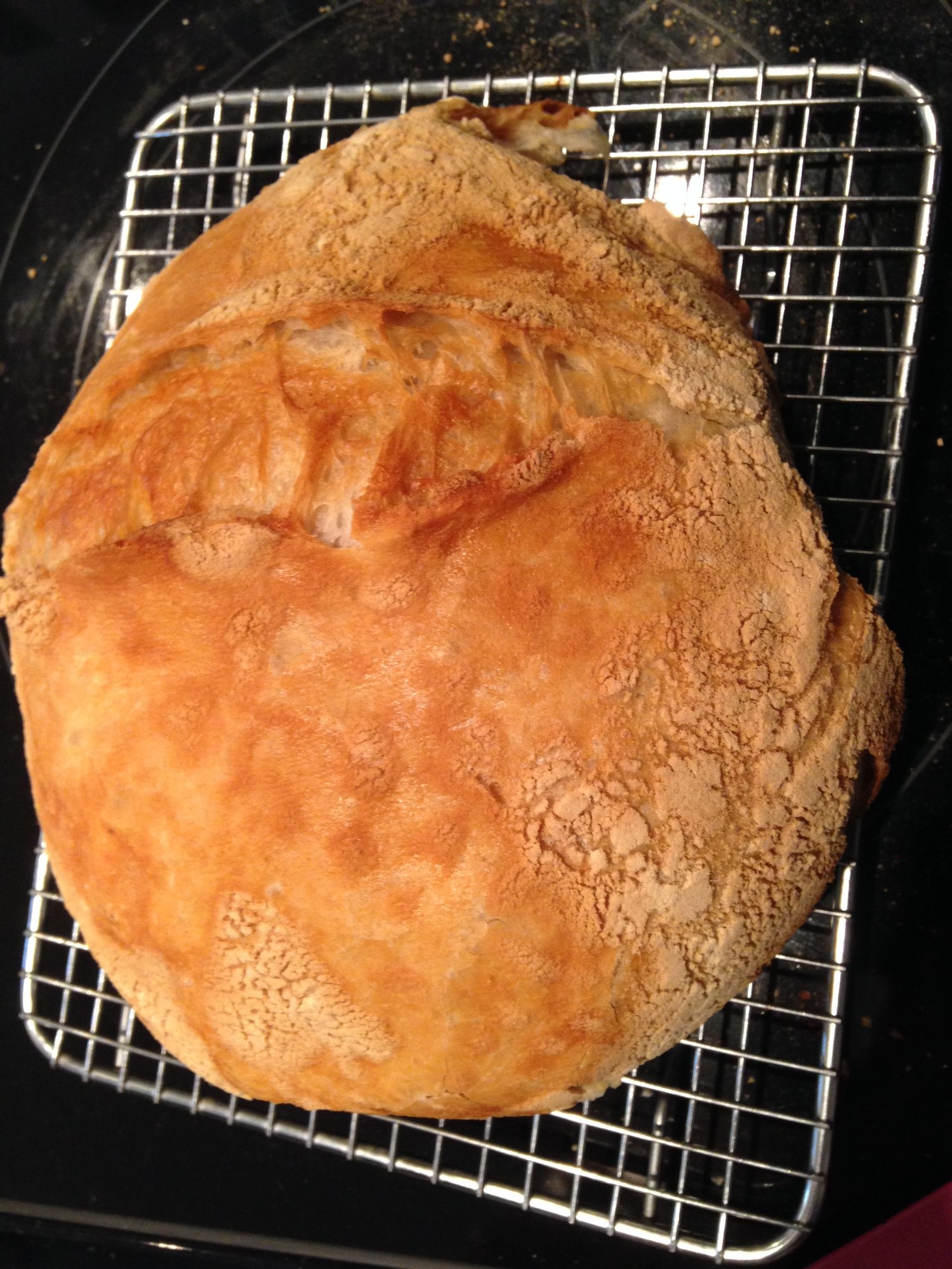When I removed the bread, I could see that it was burned to the bottom of the (very well-seasoned) DO. The top of the bread was entirely salvageable and was indeed delicious.