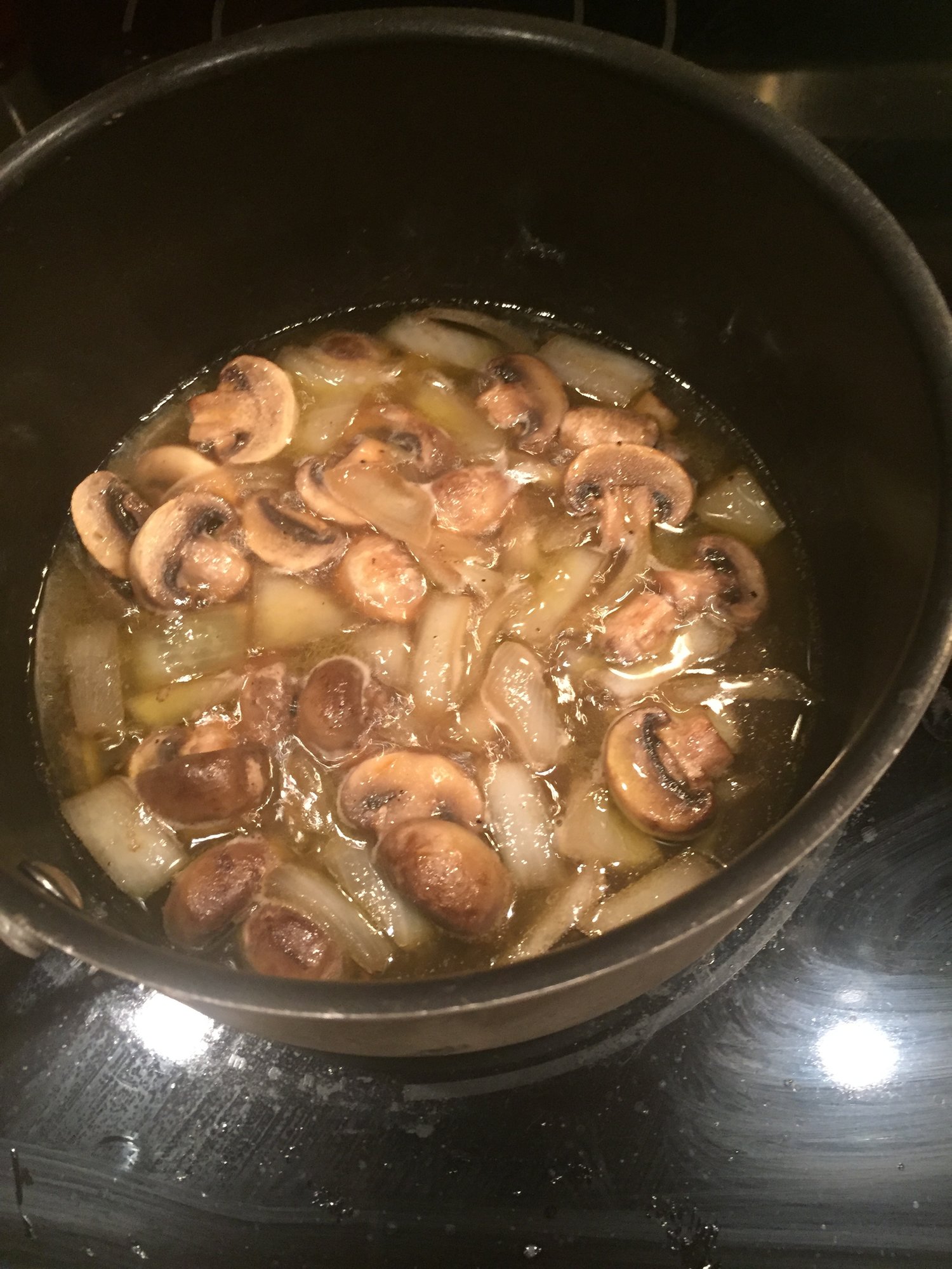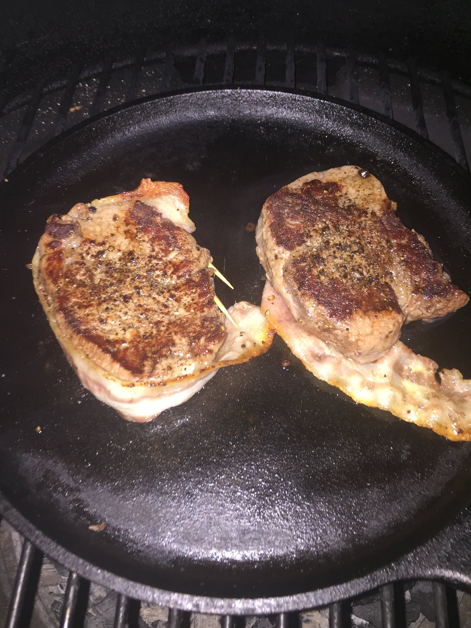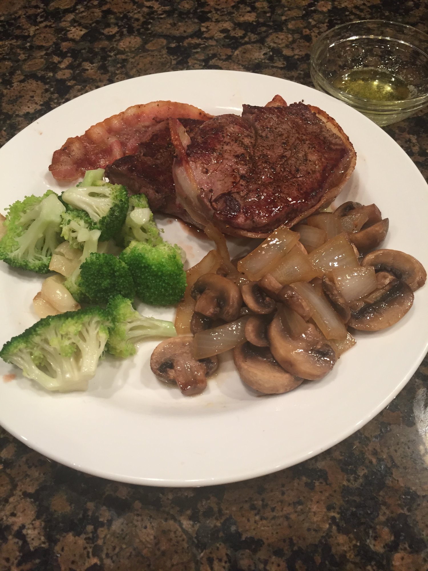 Petite filets from my bil's herd. Wrapped in bacon.  Some garlic oil and sautéed mushrooms. Trying to stay fed.  Garlic oil drizzle finish. Thanks for looking.  stay