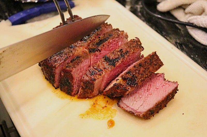 Pulled and wrapped for 10 minutes whilst the MM got up to 600F/315C and stabilized, sides put into a warming oven with plates. Seared on both sides for 1 minute and edges for 30 secs.