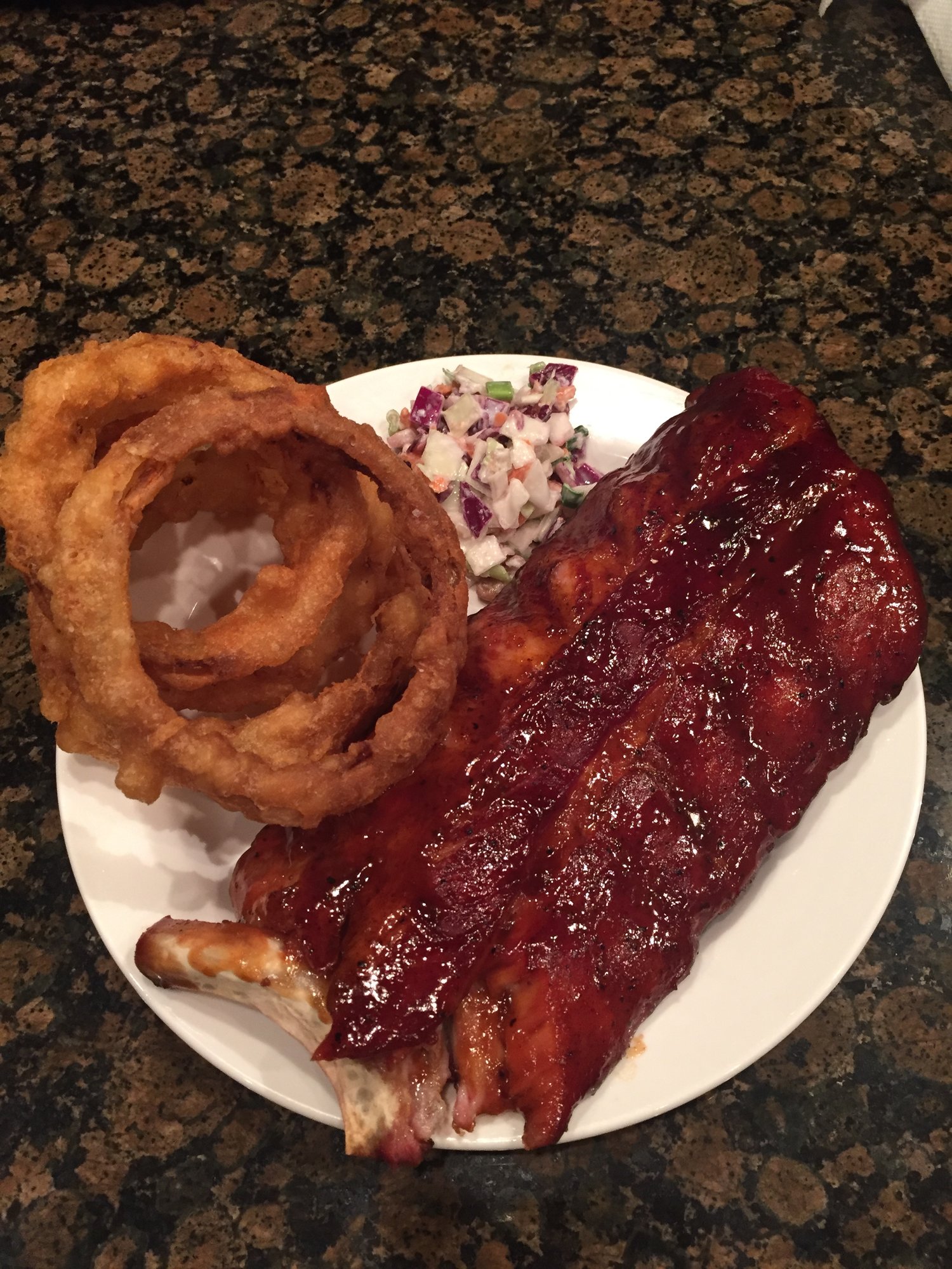Just trying to get in a few cooks before we can't. Honey Hog Hot on the bones, Honey Hog on top. Pretty sure I got that from Craig. We like it. Beer batterred rings and some slaw. Thanks for looking.
