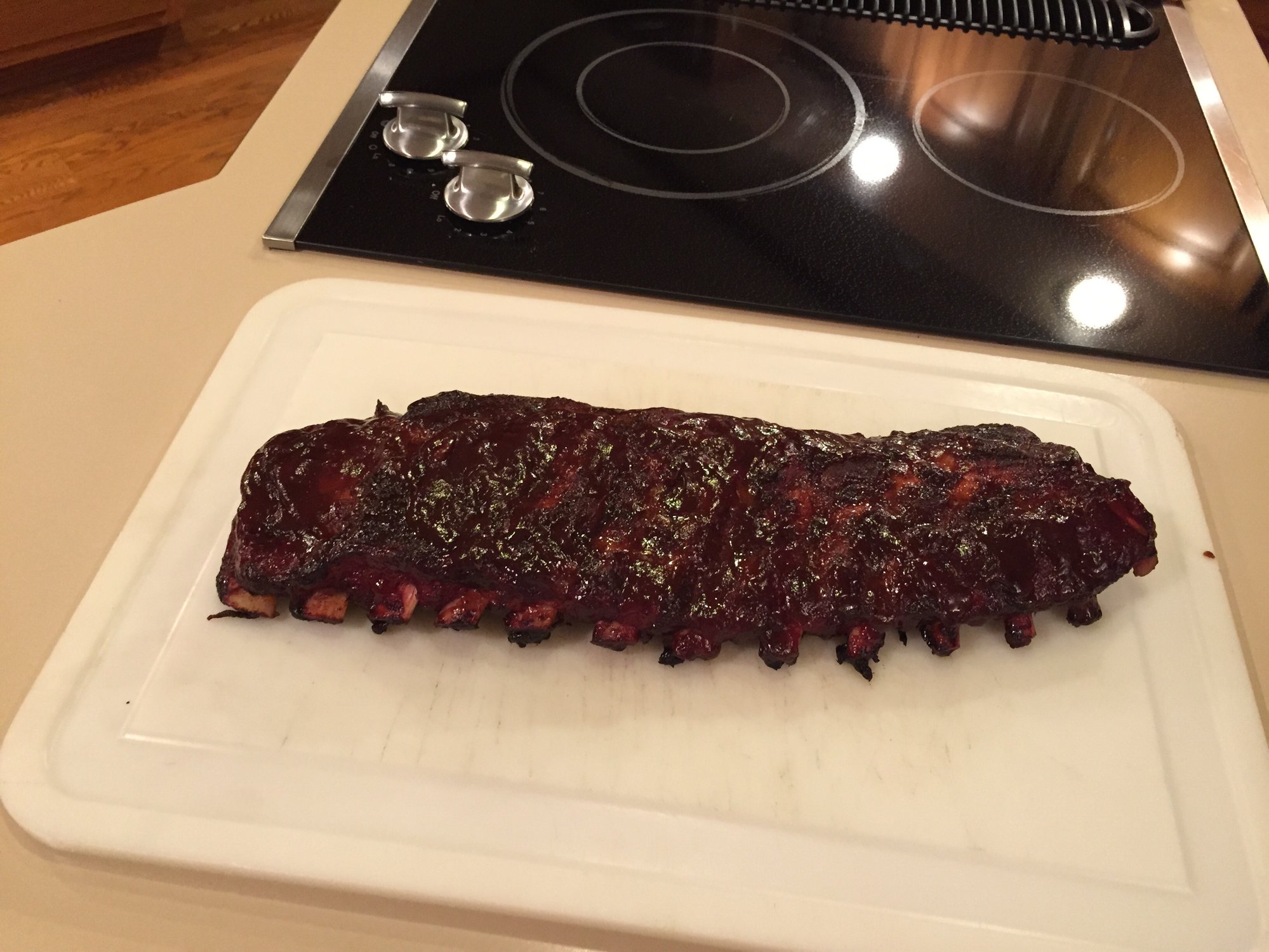 Smoked at 350/375 until they past the bend test which was 95//100 minutes then my wife shared to sauce them which then went 10 minutes longer and they were Awesome!