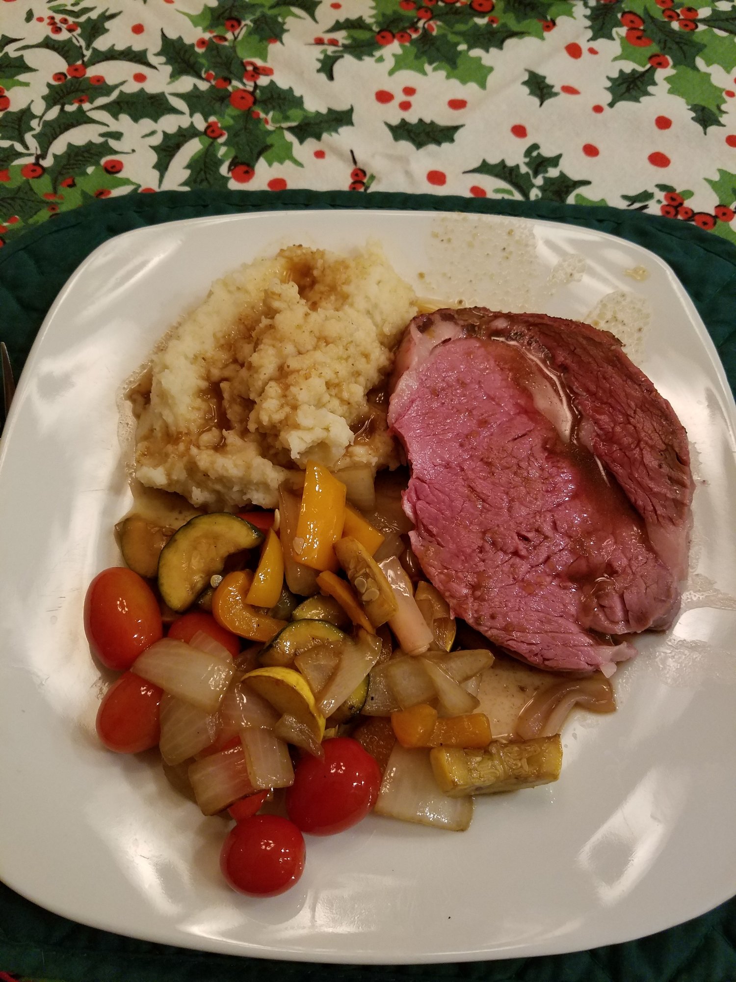 The dish was paired with Garlic Roasted Mashed potatoes and grilled veggies. The veggies are a hit in my house because they pick up just a tad bit of smoked flavor. Onions, zucchini, squash, red pepper, yellow pepper, splashed with olive oil and balsamic vinegar, cooked in a grill basket type wok on the egg while the PR rested. Small cherry tomatoes are added at the end top heat up and prevent over cooking.