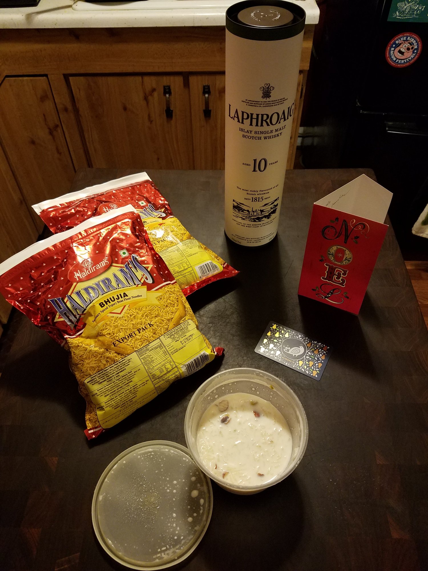 After dinner, he gifted me with a bottle of Laphroaig (again the beautiful irony), bhujia, some Kheer for my son. The Kohl's gift card was from my Italian adopted mother.