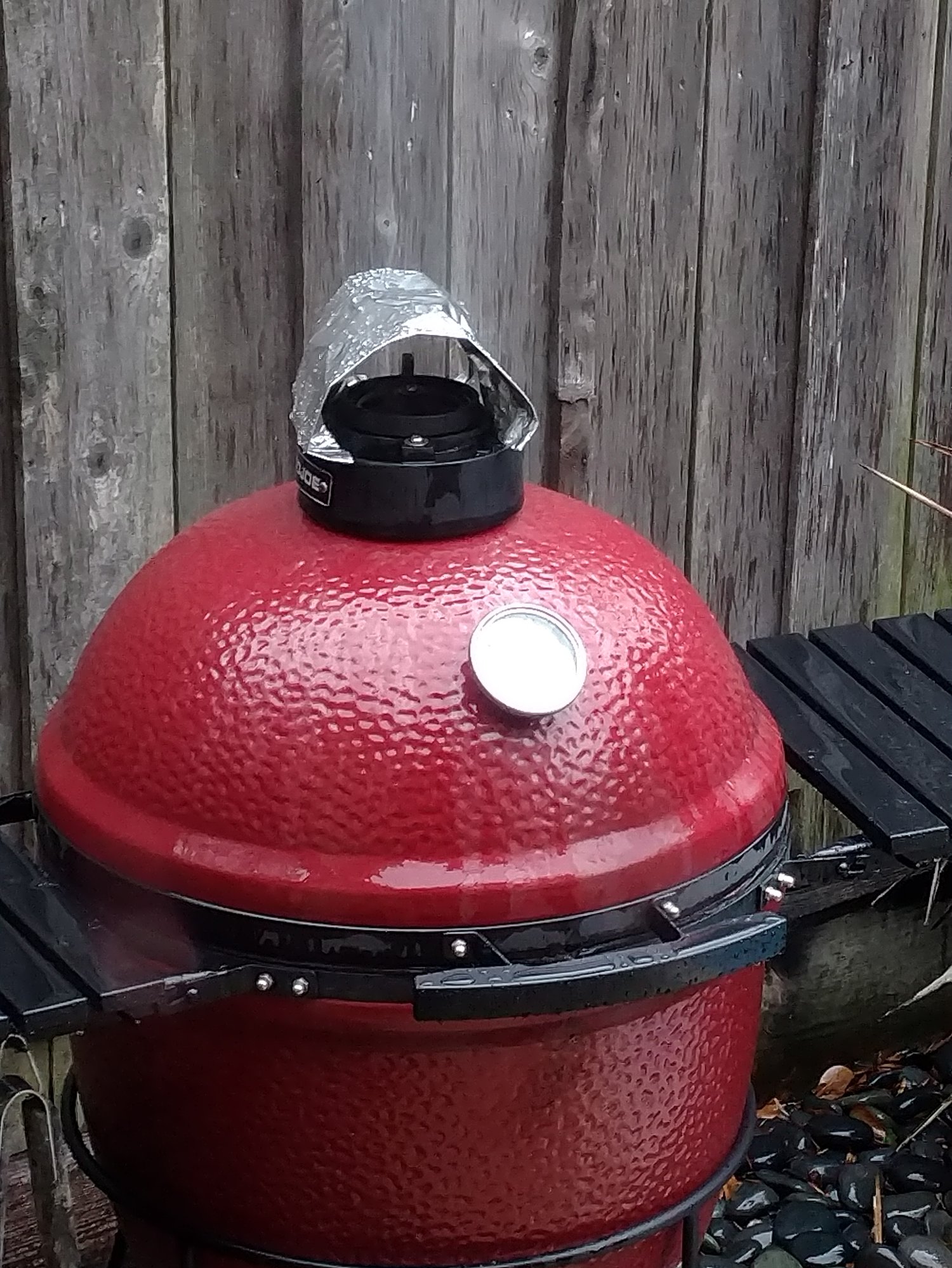 Now cooking in the rain at my brother's. He has a KJ classic and a BGE Mini but no Smokeware cap. Not windy so the foil is working OK for now.