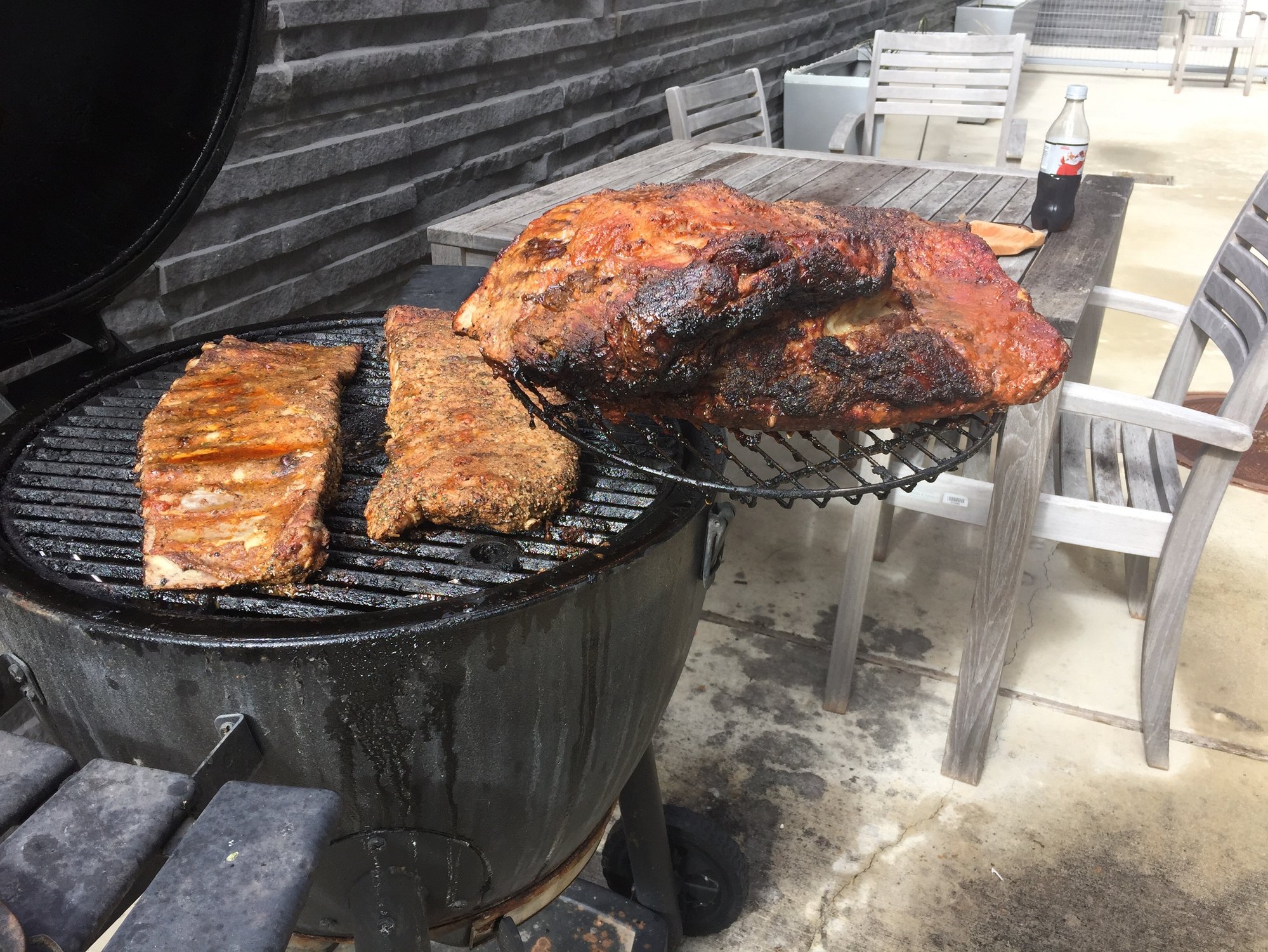 My friend was at Franklin's a few weeks ago. He said this one was better. We also dropped on a couple of racks of Duroc St. Louis cut ribs.XXL BGE, Karebecue, Klose BYC, Chargiller Akorn Kamado, Weber Smokey Mountain, Grand Turbo gasser, Weber Smoky Joe, and the wheelbarrow that my grandfather used to cook steaks from his cattle