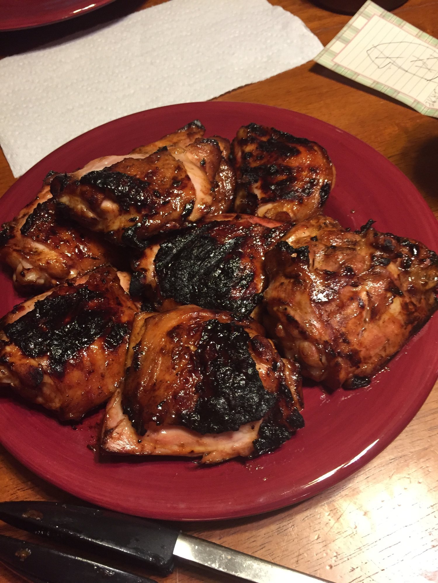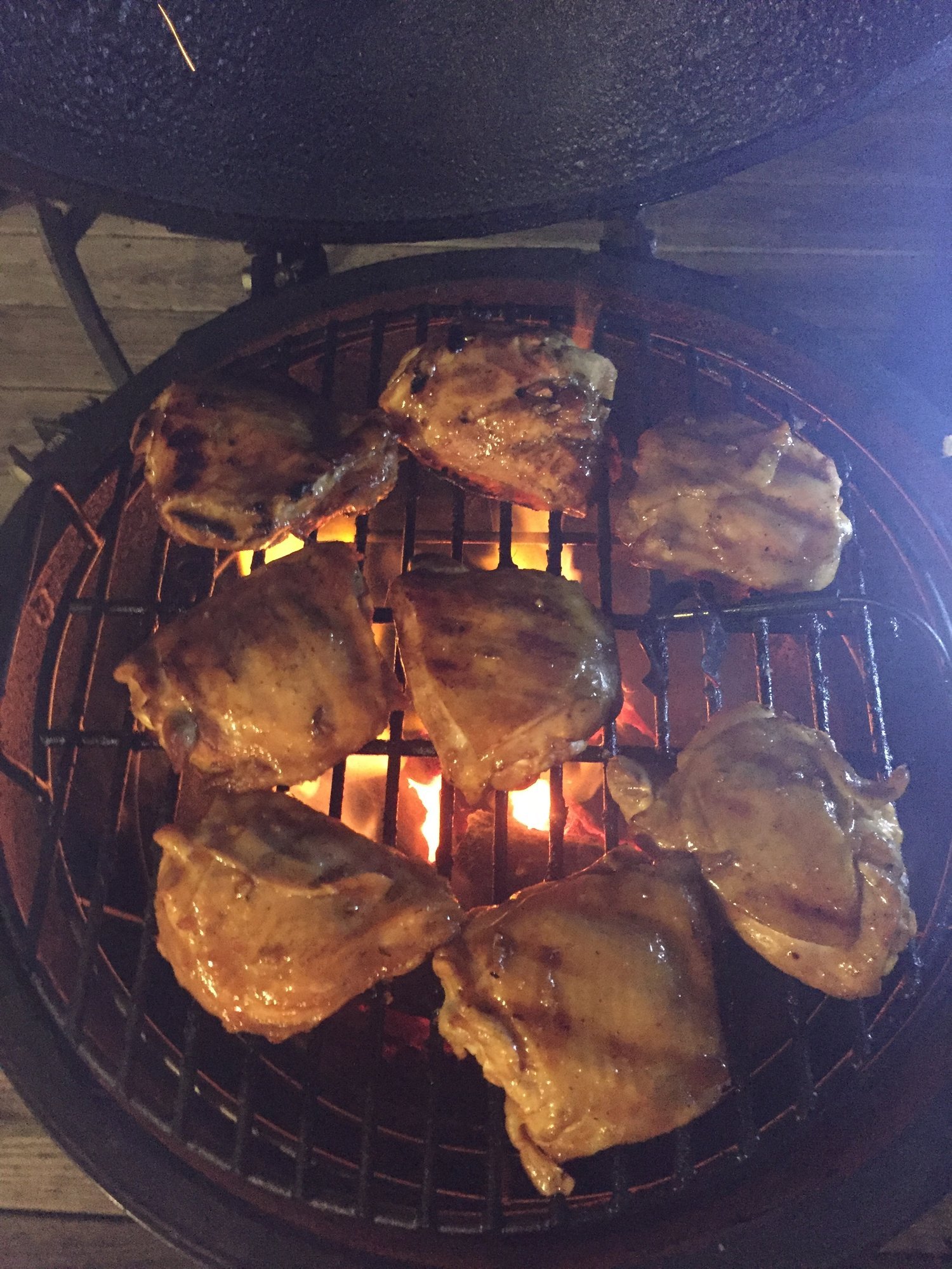 I followed Meatheads recipe and made some Huli Huli chicken tonight. It's delicious! 350 raised direct with a cherry chunk thrown in.
