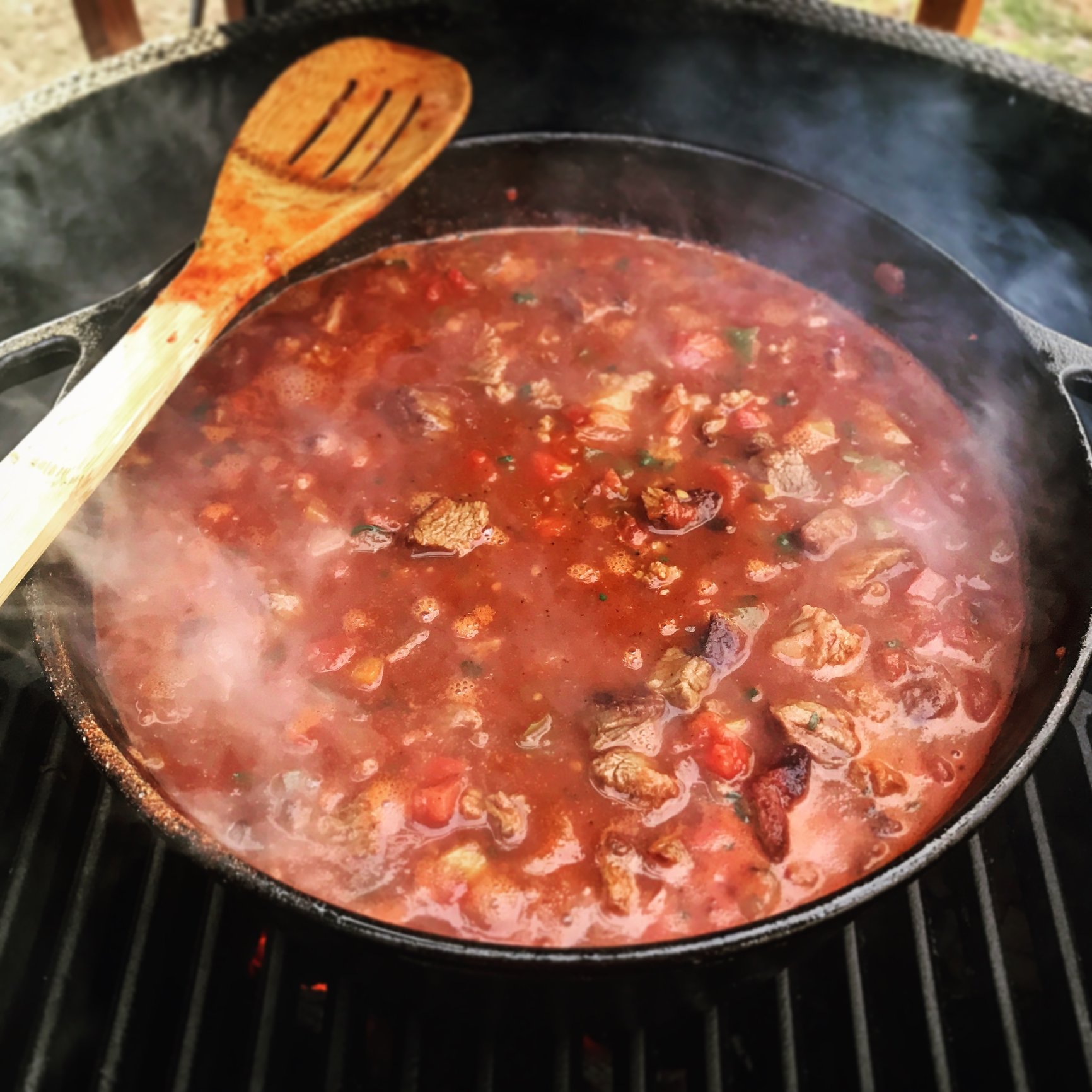 Forgot I had these pix. Whipped up this chili a coupla weeks ago using a 2.5 lb chuck roast. I grilled the steak over a bed of JD whiskey barrel wood until it was well done and until the smoke set in, then pulled it and diced it up for the chili. Then simmered it for a couple hours, covered in the DO. Had some onion sausage in there too. The smoke stood out pretty well and the steak had great texture in the end.