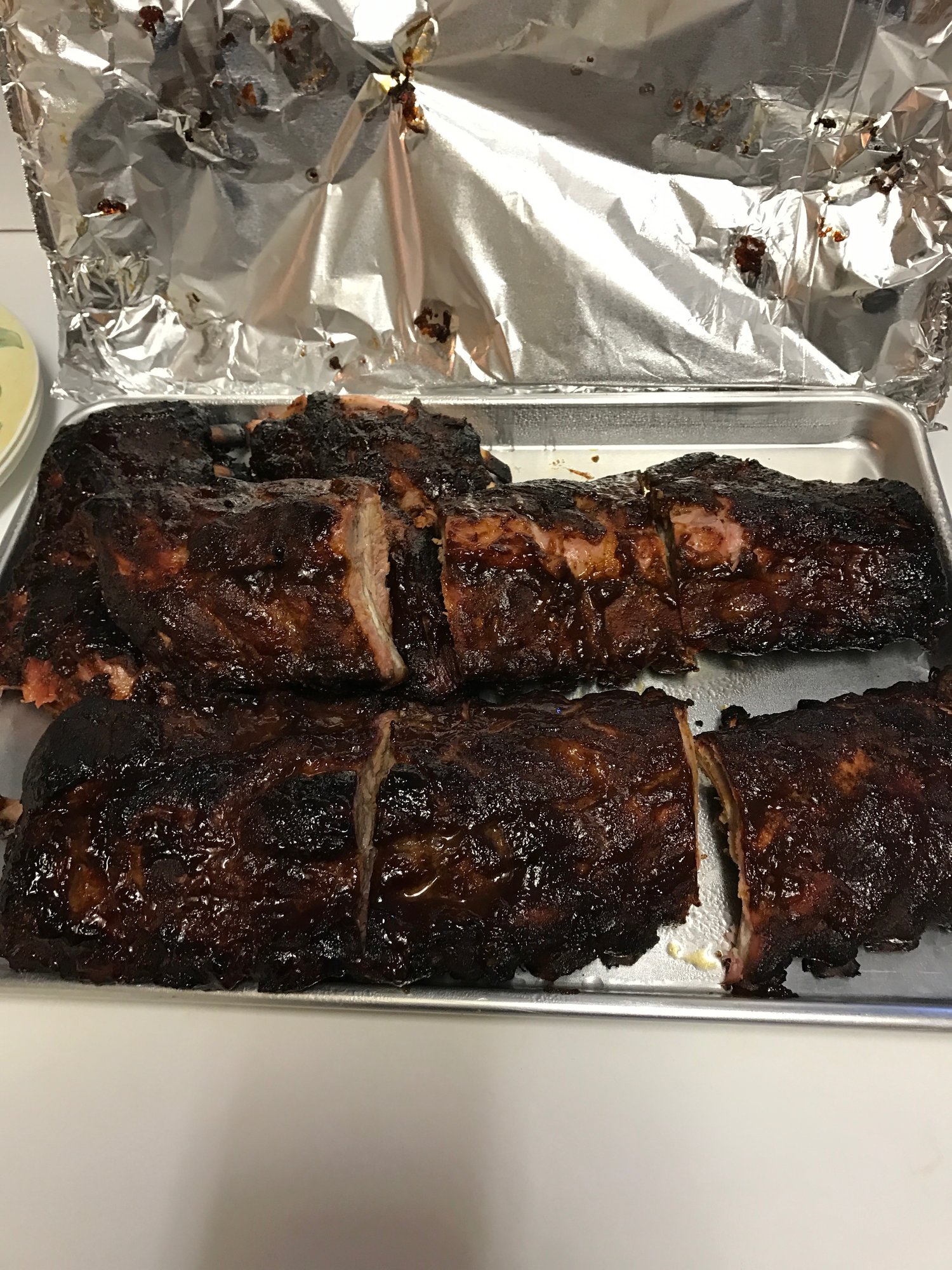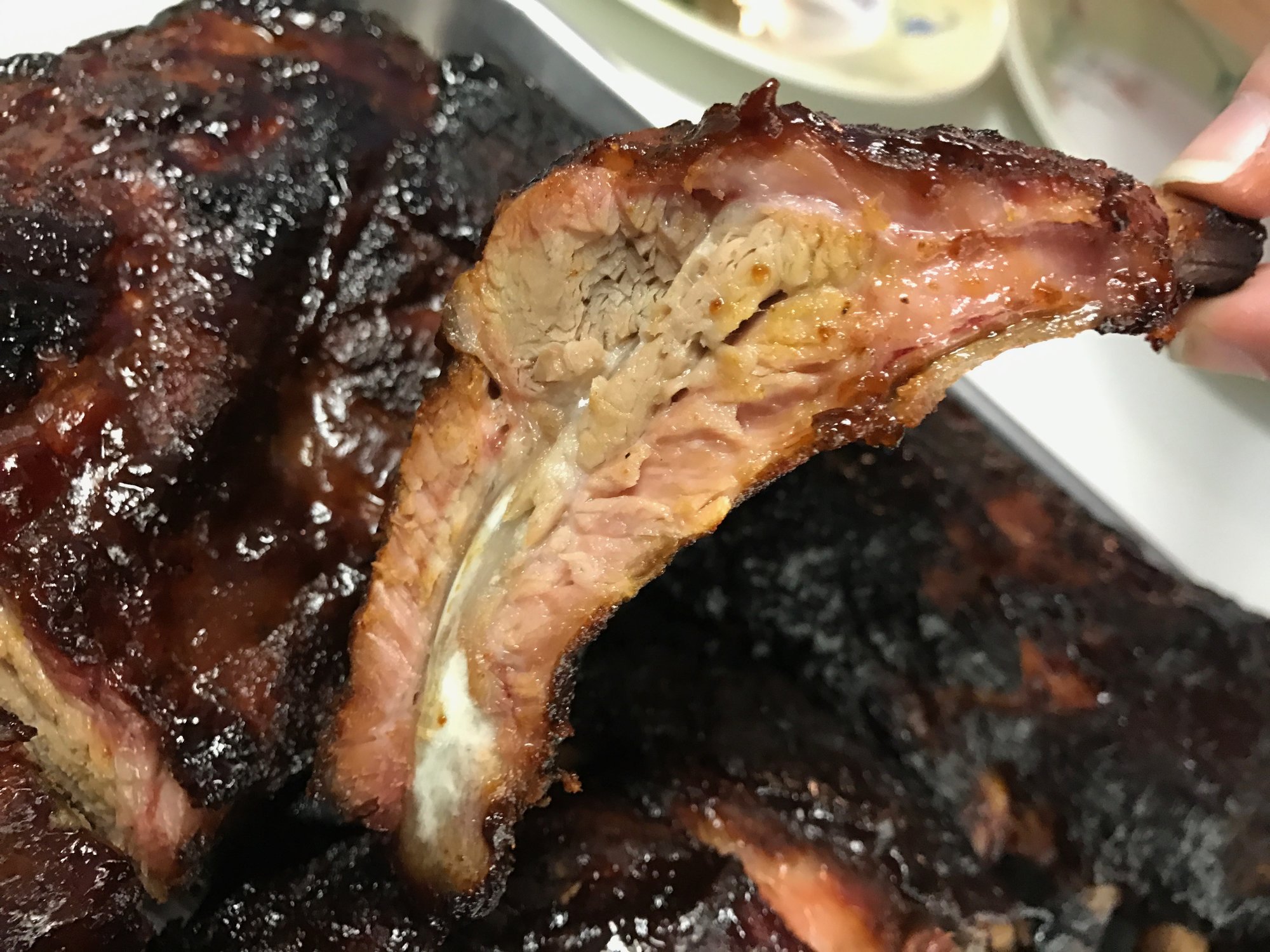 • Finally pulled them at 4:30 which made for a total cook time of just over 5 hours. The top racks were falling off the bone but the bottom rack was not. The bottom rack tasted fine but you had to apply a light pull to get it off the bone.