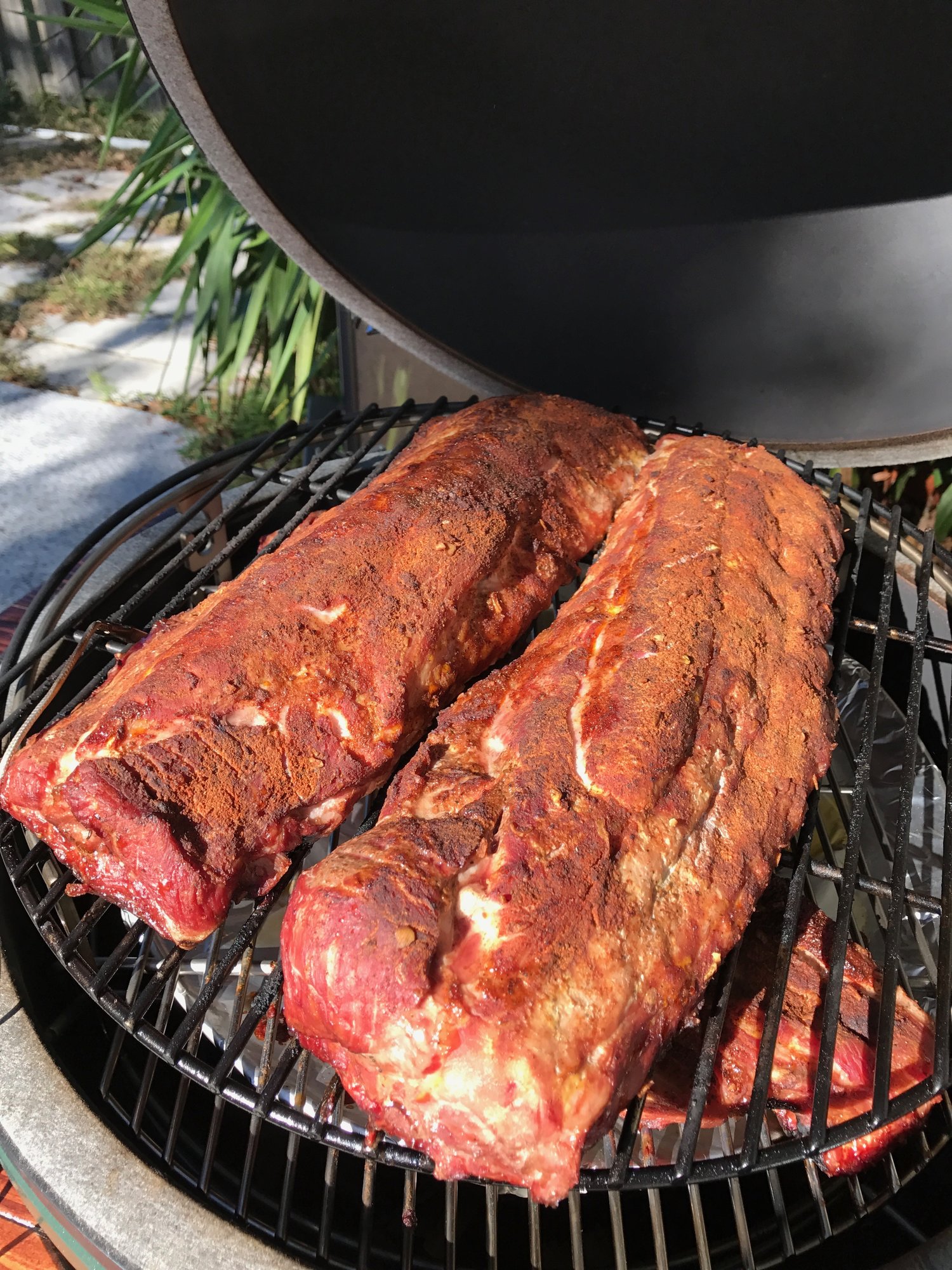 Well, today is my first attempt at Ribs,. It is also my first time to use Rockwood lump (some large pieces in that bag)and my first cook using the AR. I got up this morning and put the rub on the ribs. I didn't find any membrane that needed removing. Not sure if it was already removed or if I just didn't recognize it. No big deal. I put the ribs back in the fridge for an hour and started up the Egg. Threw in some Cherry chunks and then some Pecan chips just before the meat went on the grill. I attached the Flameboss pit probe to the lower grate and laid the meat probe on the upper grate. I waited for the pit temp to stabilize at 225 before putting on the meat. I'm not too happy with the temperature control as the pit went up to 310 and I ended up shutting the Smokeware dome to get it to come down. Its now at 177 with the Smokeware cap open to the width of a nickel and the temp is dropping with the fan at 100%. Just opened the top vent to about 1/2" to see if it will bring the temp up.