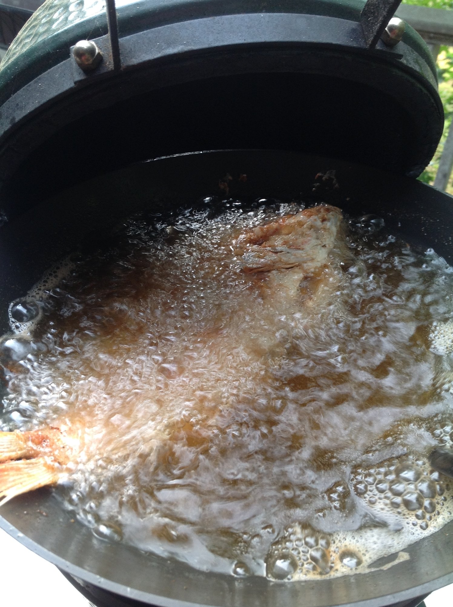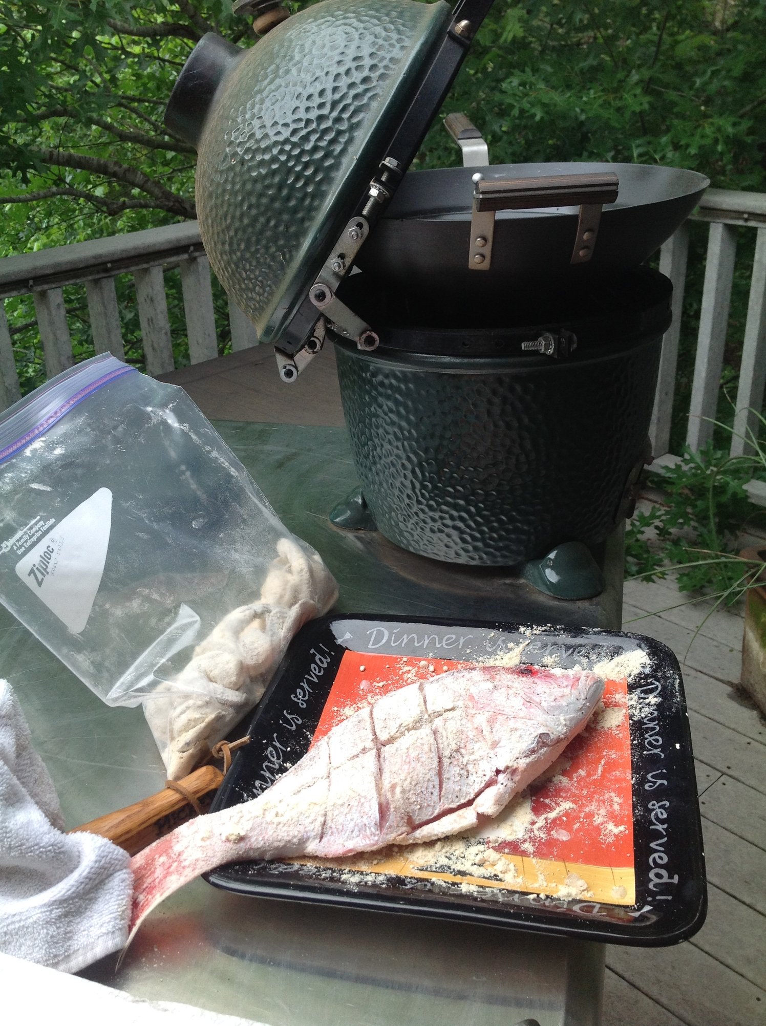 Get cast iron skillet prepped in egg direct at 400-500. Season fish with thin coat of softened butter and then blackening spices. Place chicken breast filet in skillet till 150F-160F IT. Enjoy. No fishy taste