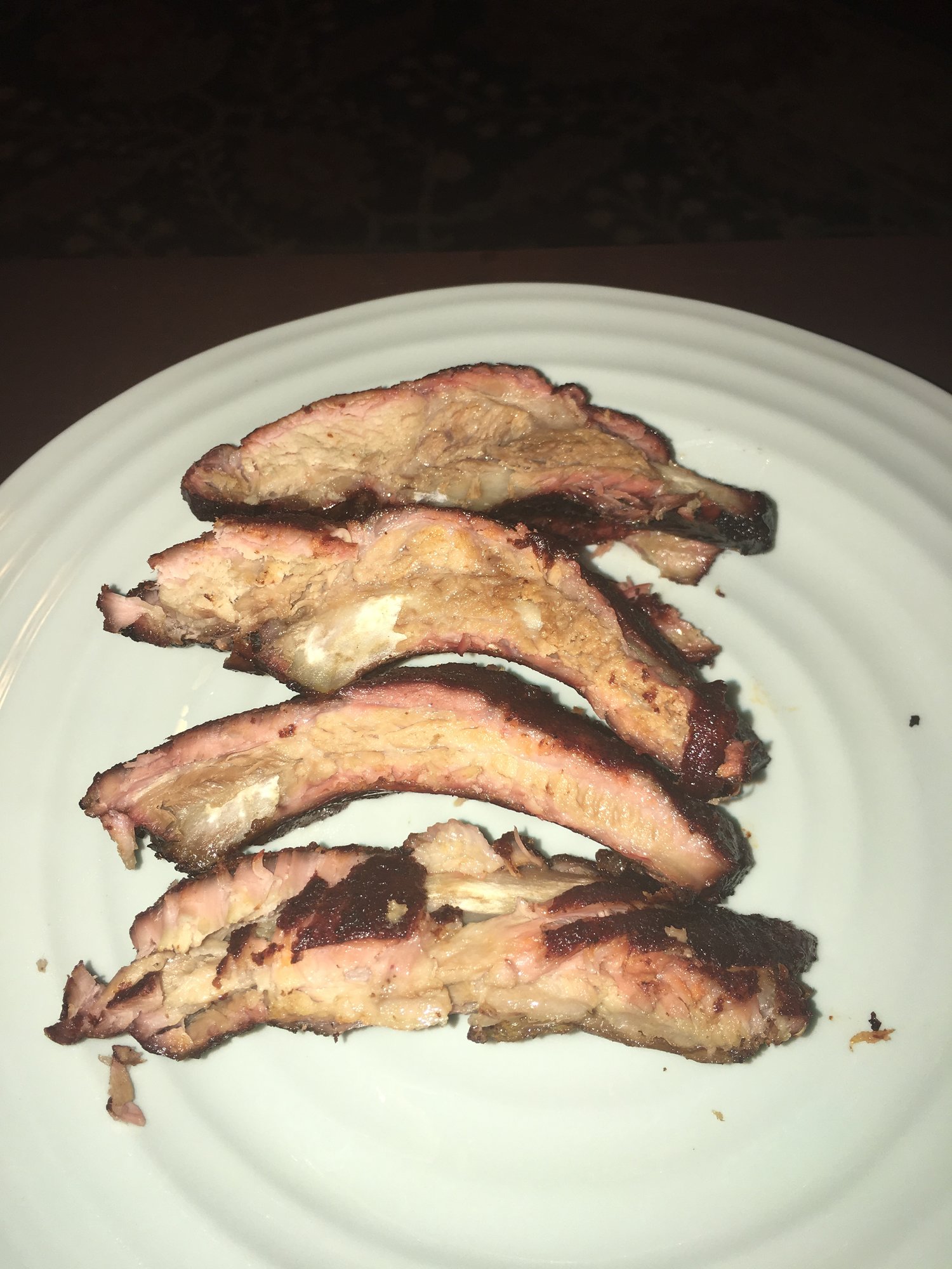 The ribs can be pretty good if a little under done. The meat will be tender, but some shreds will cling to the bone. But best is when the bones are left clean, quite dry, and the meat comes away clean w. the fat crisp, not burnt.