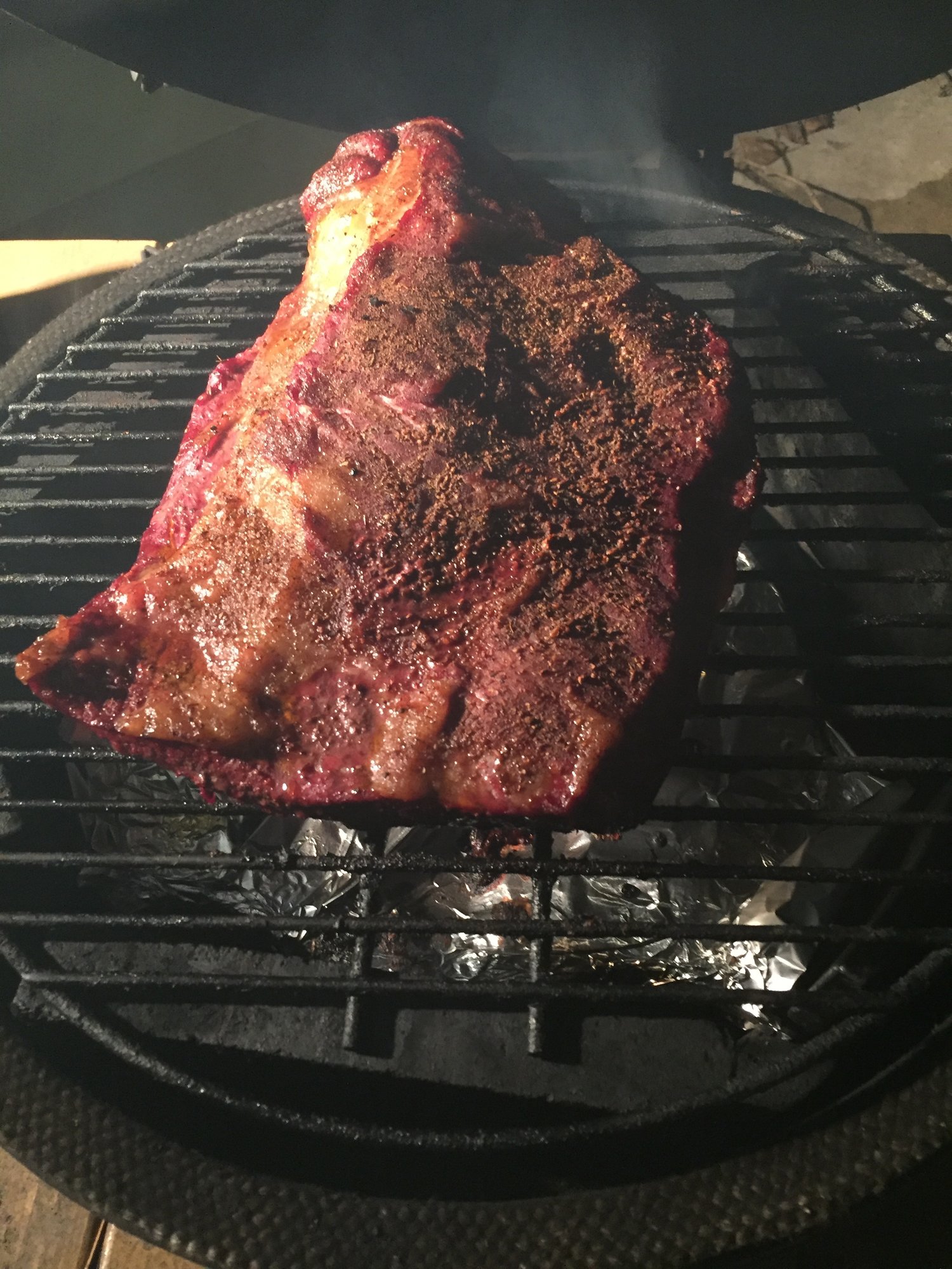 I got the egg fired up after work and on went a brisket. I went a little heavy on the oak chunks as this brisket is for @EggObsessed smoked chili. I've made it before and it is killer. I just took a peek and I can see she's collecting the smoke nicely. Here it is and there will be more pics to follow. I like to do my briskets flat side up. I got this one from a guy at work who has cattle and had this slaughtered. He's been doing a few briskets lately and says so far they have all been so-so. With that said, I can't believe how thin the flat is on it. It's also pretty trimmed up. There is no silver skin on the flat and he said he's never seen silver skin on a flat before. He just got into smoking so it's all new to him. I don't think he has a very good butcher...Anyways... it's for chili so...