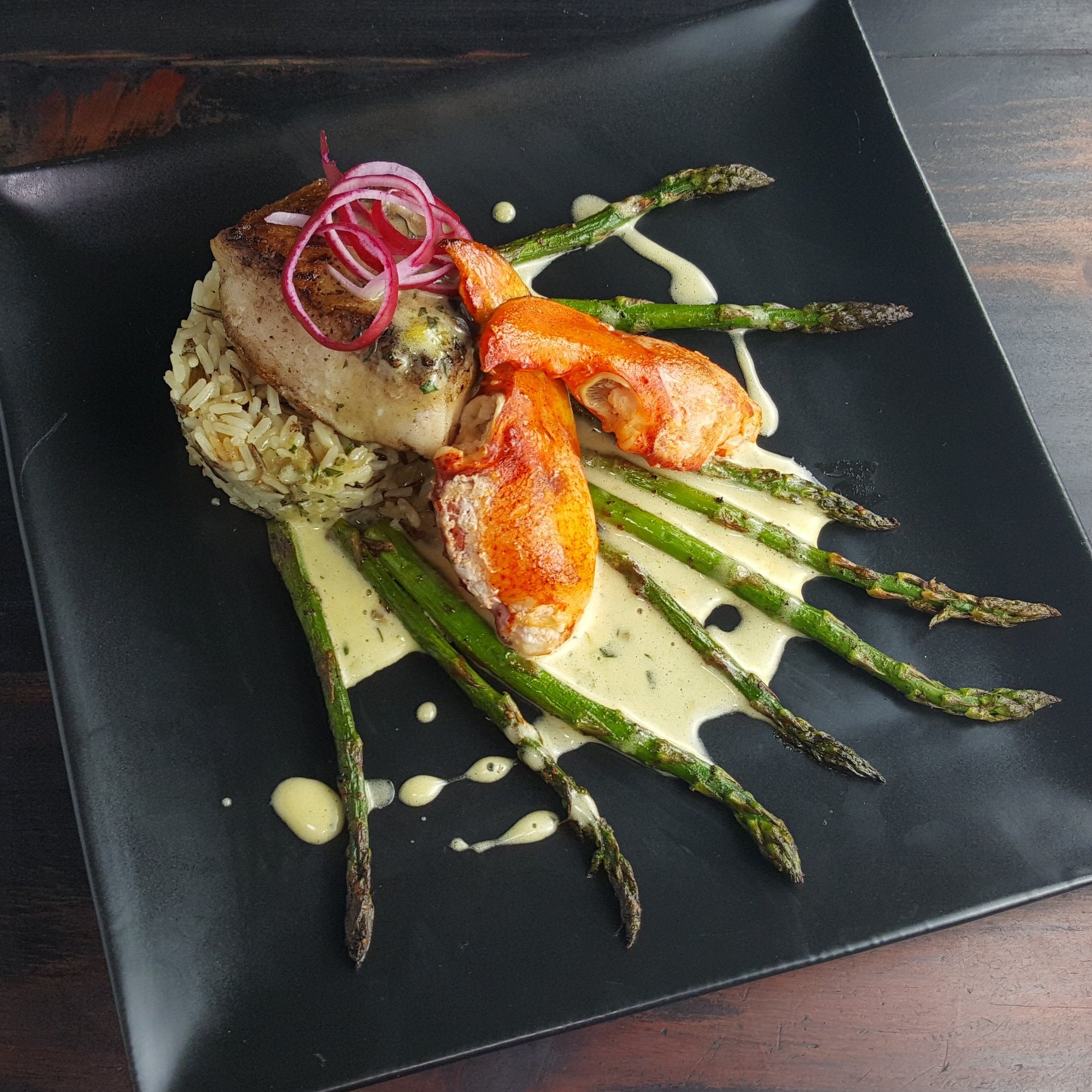 My Valentine's Day dinner was a twist on a classic Oscar. I replaced the beef filet with a Chilean sea bass (seared on a hot soap stone) and replaced the lump crab with whole lobster claws. I served this with asparagus and a wild rice pilaf topped with a classic Bearnaise. Unreal flavors!
