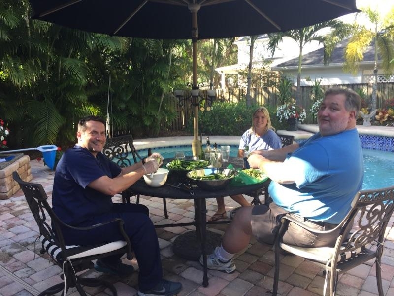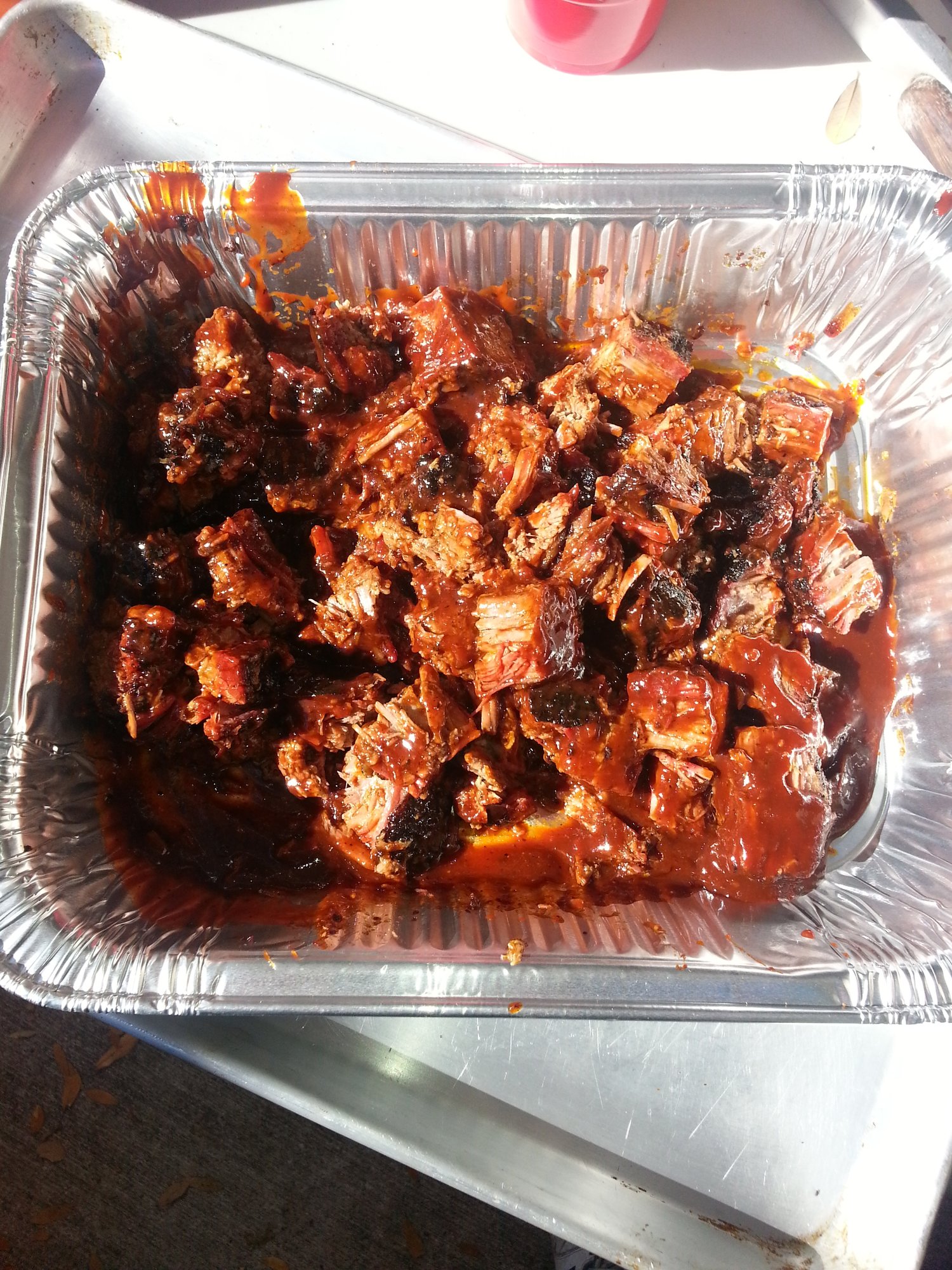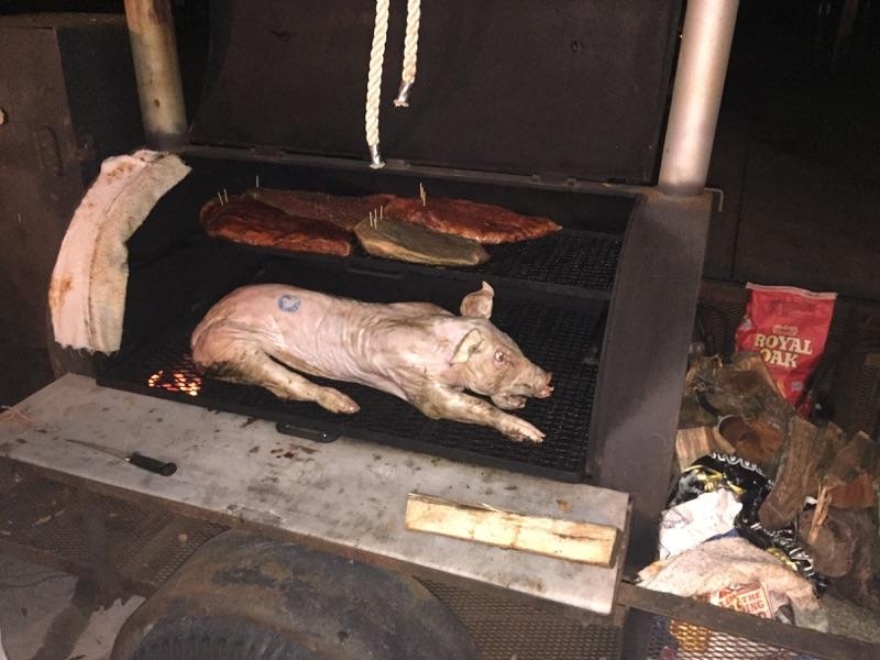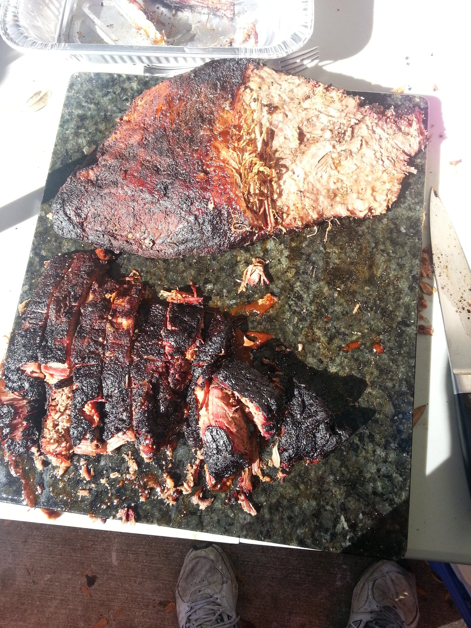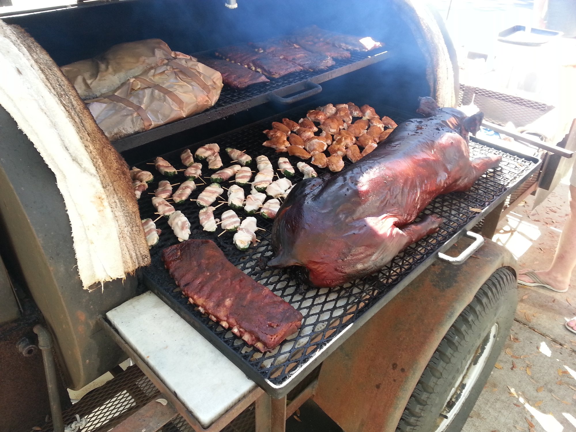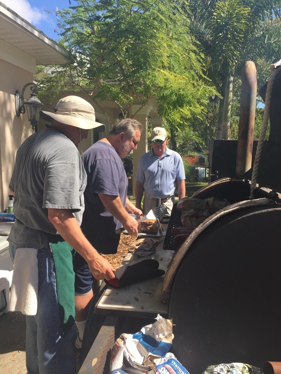 This past weekend I flew to Tampa to help a friend of mine with a fundraiser for the YMCA. It was held at his house on the front lawn and on the meat menu was a 50 pound pig, 6 pork butts totaling 50 pounds, 4 briskets totaling 40 pounds, 20 pounds of wings, 5 pounds of sausage, an 11 pound @Eggcelsior Baltimore pit beef, 12 racks of St Louis ribs and 100 bacon wrapped jalapenos. @thetrim stopped by on Friday to help us with the prepping of the jalapenos. Unfortunately he had his son's Confirmation on Saturday so he couldn't attend, nor partake in all the good eats, but gave a very nice donation. Thanks Steve. There were tons of sides, beans, cole slaw, potato salad, mac and cheese ect but we were in charge of the meat. We had a Shirley type smoker, a yoder, and a large egg at our disposal. Most of the costs were covered by various individuals/companies so everything we took in at the door was profit. His goal was $5,000 and as of Sunday morning, we were at $4,500. All the food turned out pretty good. The brisket was a tad dry but the burnt ends and the ribs were the bomb. For all the inquiring minds out there the toothpicks on the brisket represented the different rubs we used. Unfortunately it was too hectic to compare and contrast. Below are some pics.