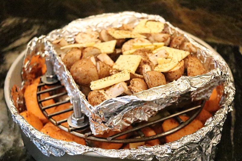 Rib-eye steaks rubbed with Cosmic Cow then reverse-sear cooked at 250F/125C until meat hit 125F IT (approx. 1h30m), veg cooked in foil cover underneath. Then the meat was tented and covered with a towel. The veg wasn't quite done so Egg up to 400F/200C for another 15 minutes.