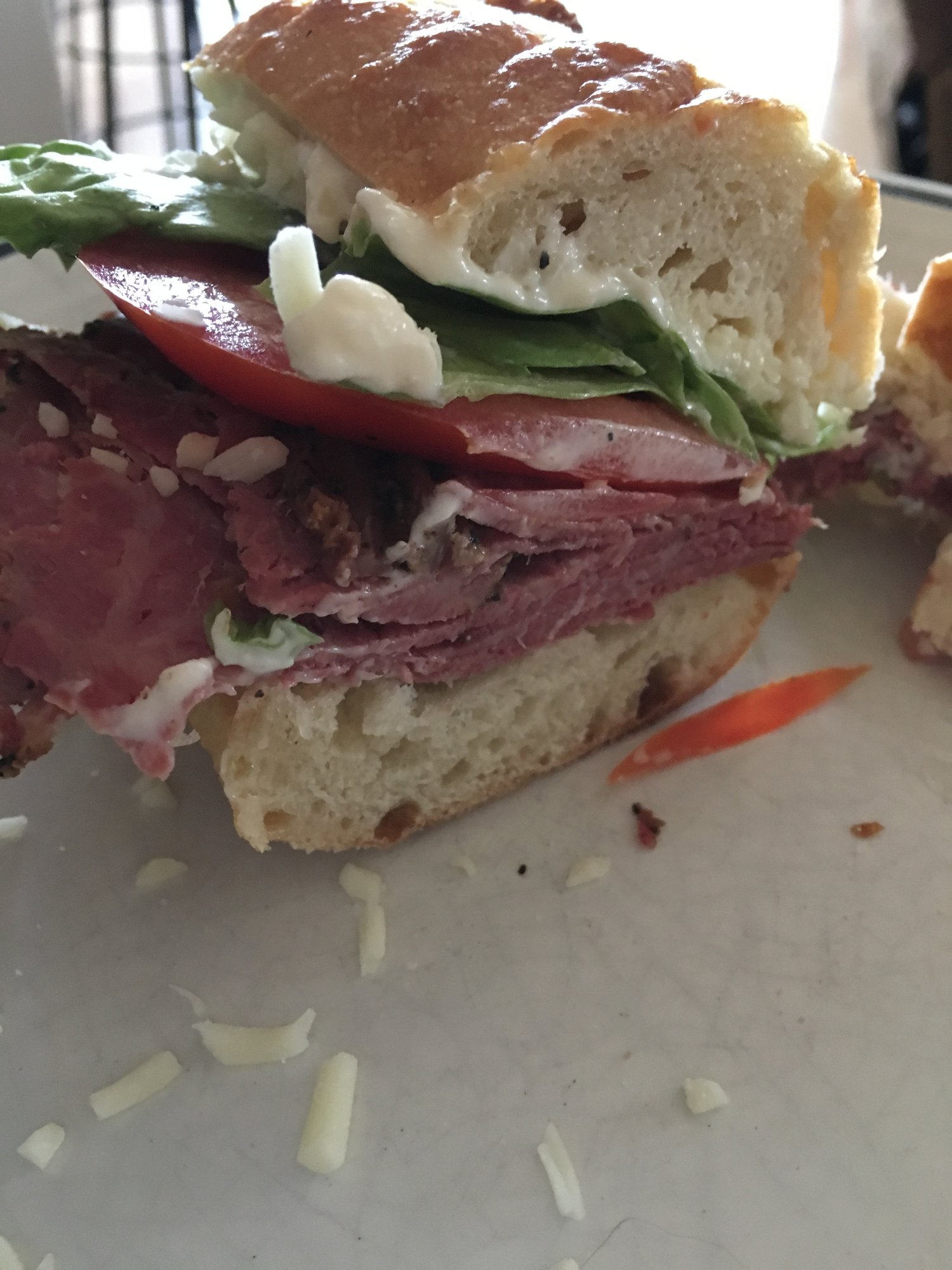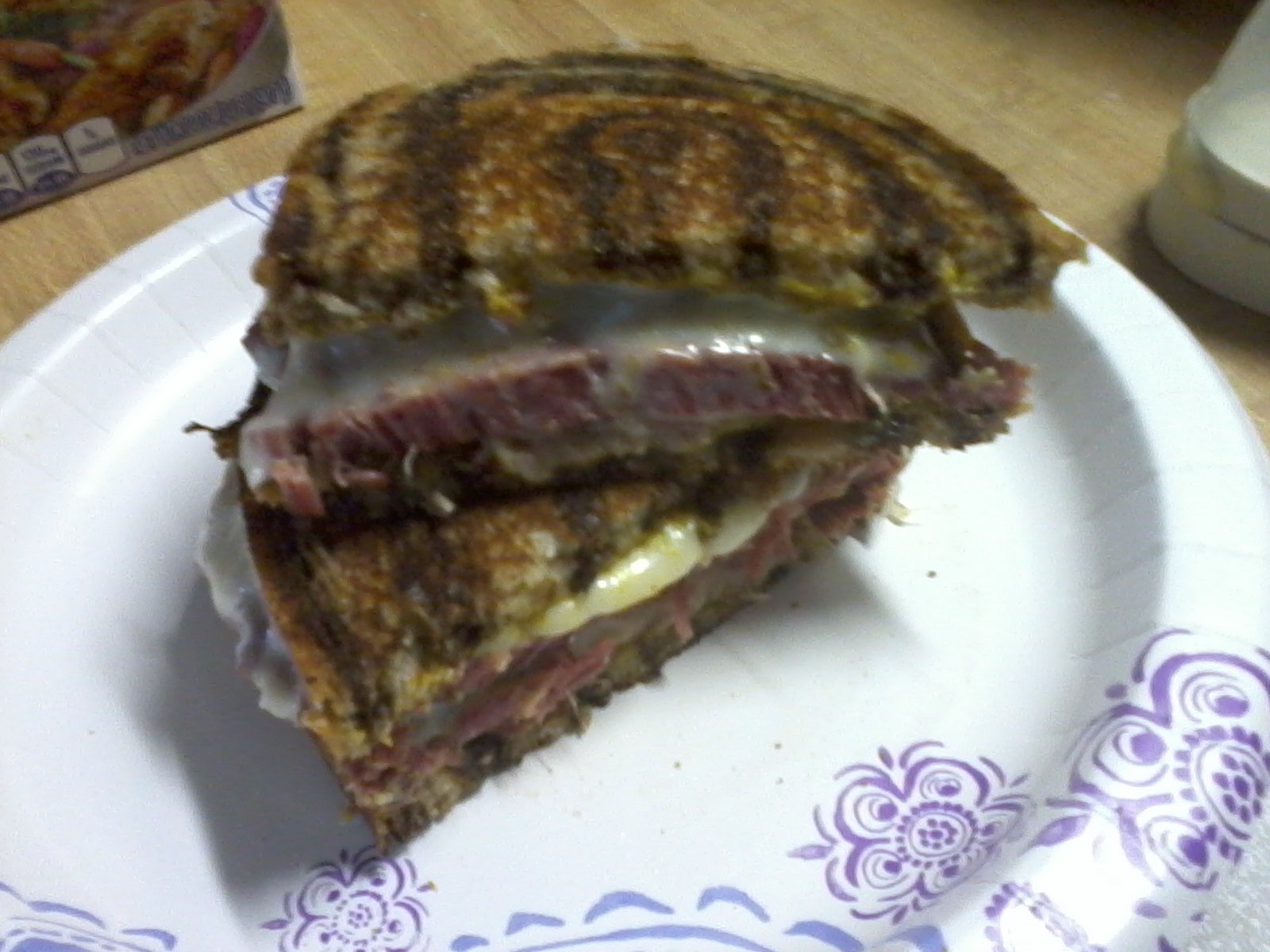 steamed the leftover corned beef then cheese and a good deli mustard, grilled rye. dont know why people dont like corned beef. this was a corned eye round, never seen that before