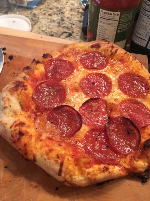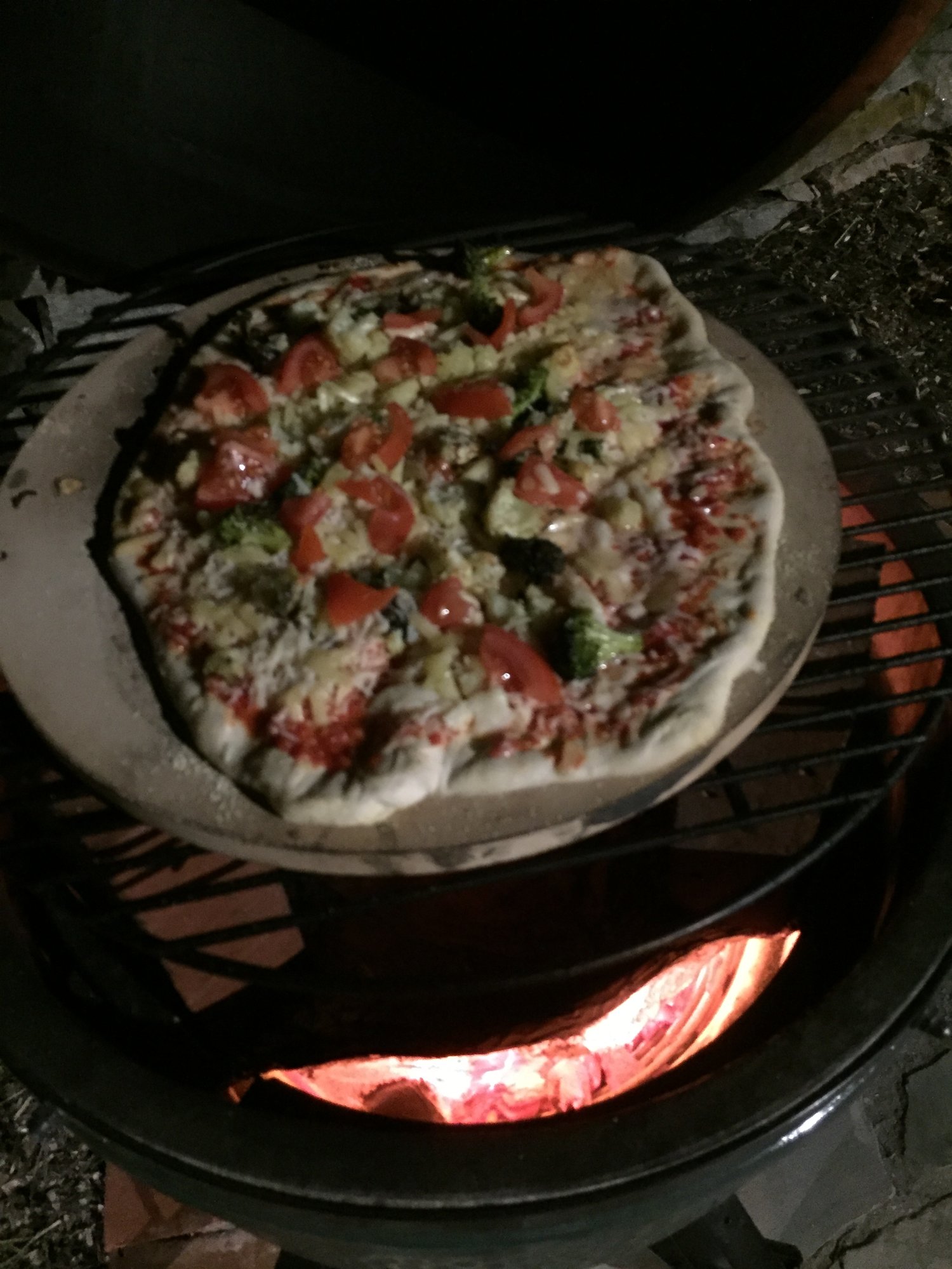This was both frustrating and fun. It was fun to get the little ones involved making their own pizza. I thought I had a pizza stone, but after starting the egg, I couldn't find it. So I improvised and decided to cook it right on the convegtor, legs down. The kids put theirs together, (pep and cheese, can you believe it?) and I put it on the egg at about 550F. It took maybe 6-7 minutes and came out great. Quiet kiddos must of meant it was done to their liking. While I was getting them their food, and prepping the next pizza, the egg temp got up real high, like 700+. I thought, "oooh, this will be quick". I put the pie on, when it looked pretty, I took it out... well, looks can be deceiving. The bottom of the pie was burnt to a crisp, making it mostly inedible. I made due by eating it like a carb conscious dieter and just ate the toppings off. Hey, at least the kids were happy. Photos are of kids pie and pre-burnt parents pie.