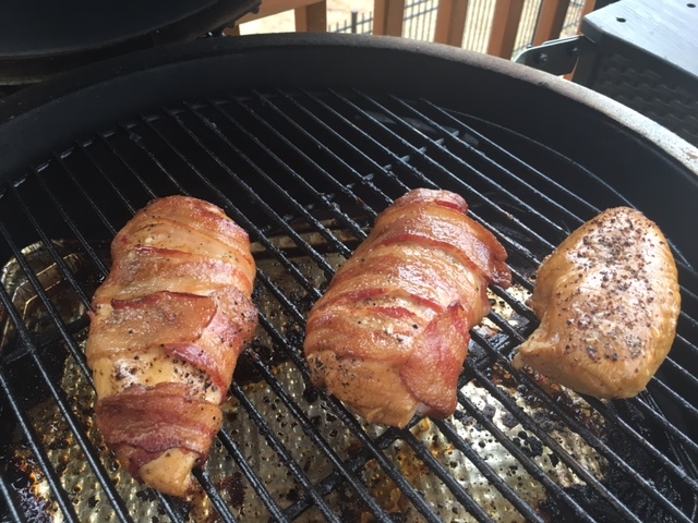 This was a quick week-day cook and my attempt to be healthy. Bacon is low-carb, am I right? Cooked indirect at 375 for about an hour. I threw in just a small handful of woodchips. I really enjoyed the casing on the chicken breasts. I think it was the smoke that gave in that nice little pop. The bacon was good too, b/c, well... it's bacon.