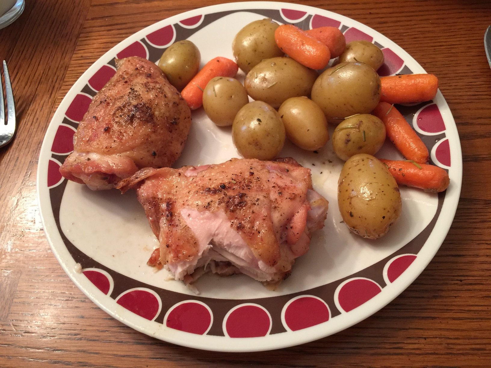 The skin was crispy, and the potatoes were soft. The carrots were not real soft, next time I may put the veggies on about 30 minutes early. Taste was good, and the family was complimentary. Successful first try, thanks for the help! Took one bite before the pic...