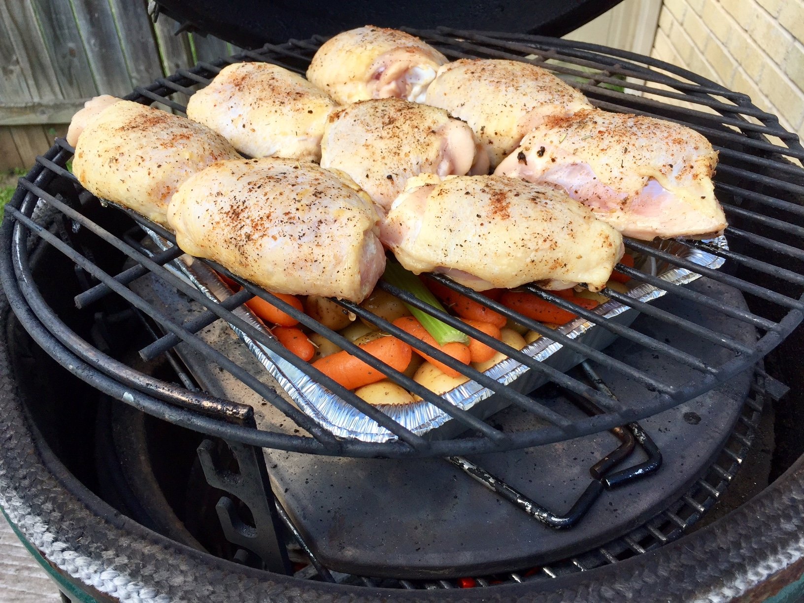I finally got around to trying the chicken and veggies dish, with veggies in a pan underneath the chicken thighs. Veggies have rosemary, salt, and pepper. Thighs have salt, pepper, Dizzy Dust, and a touch of Adam's citrus rub. Doing 350 indirect, I guess 1+ hours.