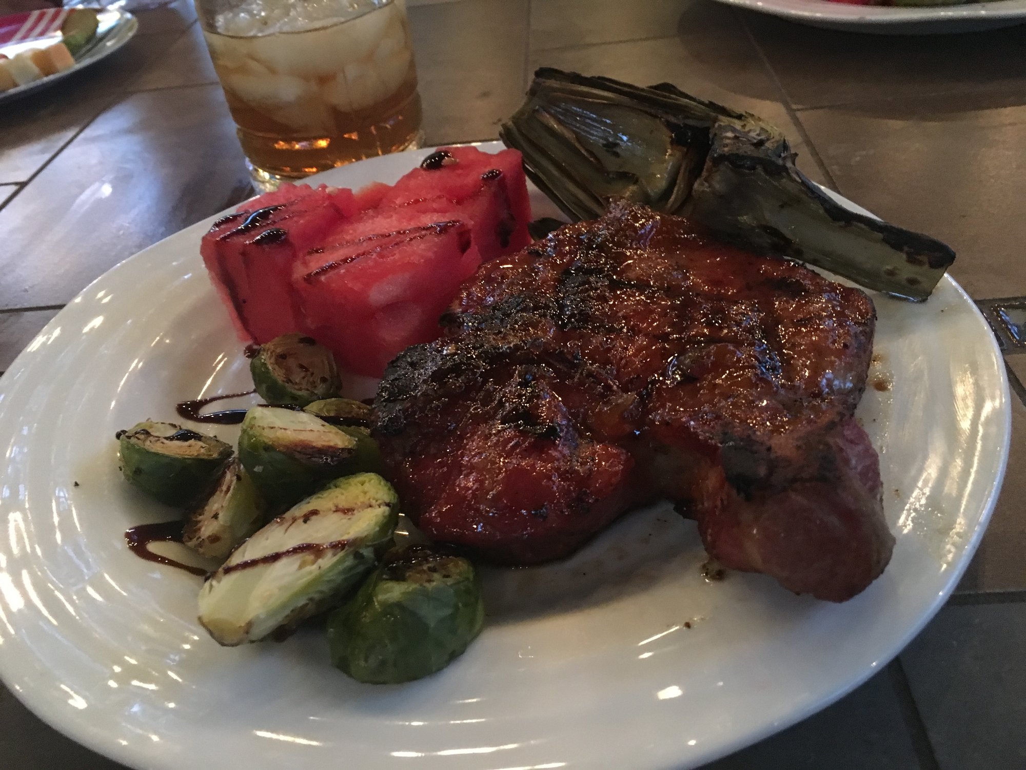 Reverse seared bone in pork chops with a Mango-Cayenne glaze. Brussel sprouts and watermelon with balsamic reduction, grilled artichoke with a garlic butter sauce...