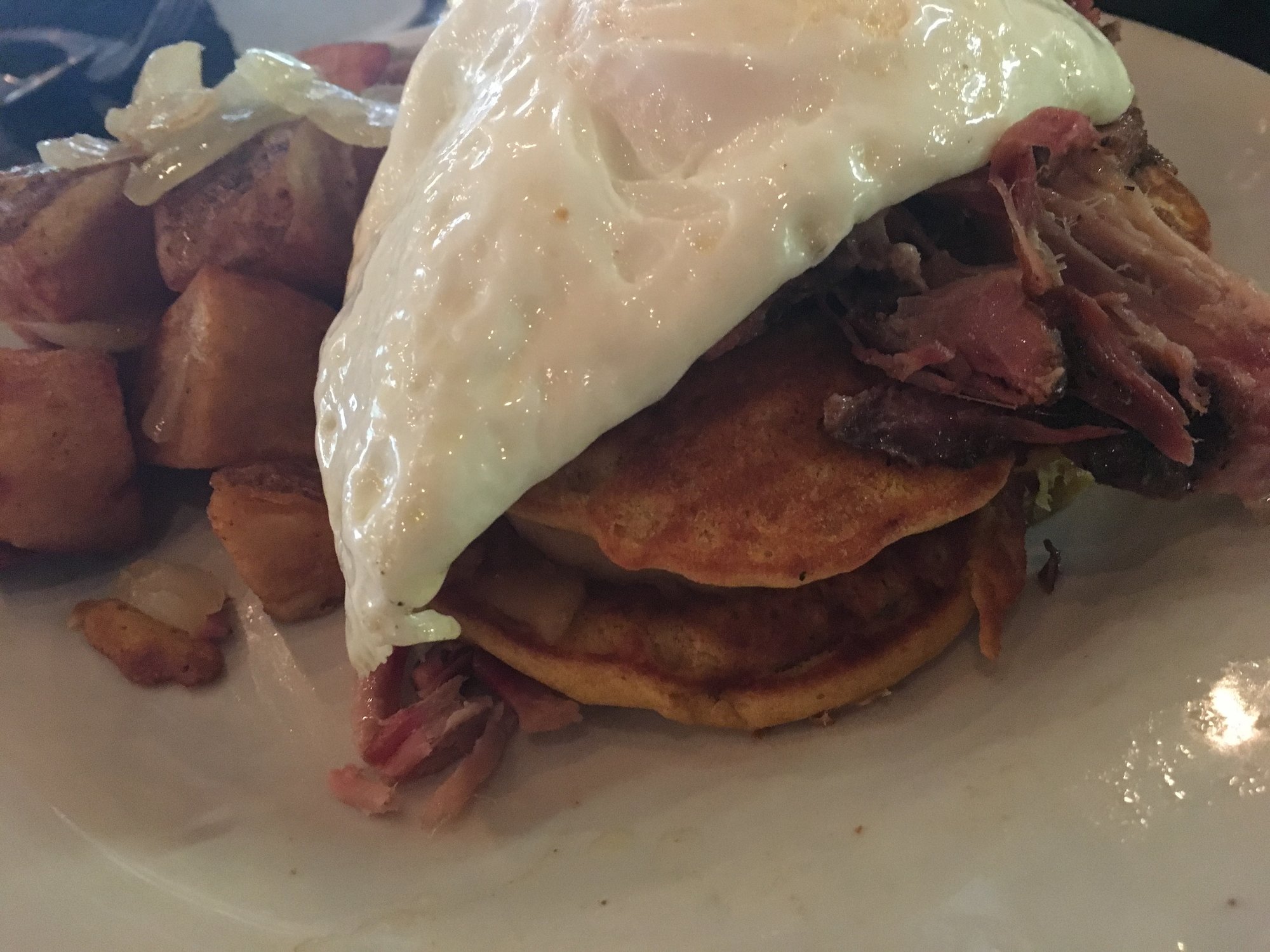 @Hntnhrd oh there was bacon. This was breakfast. Pulled pork and bacon, sweet potato pancakes. Over easy egg and some potatoes and onions.