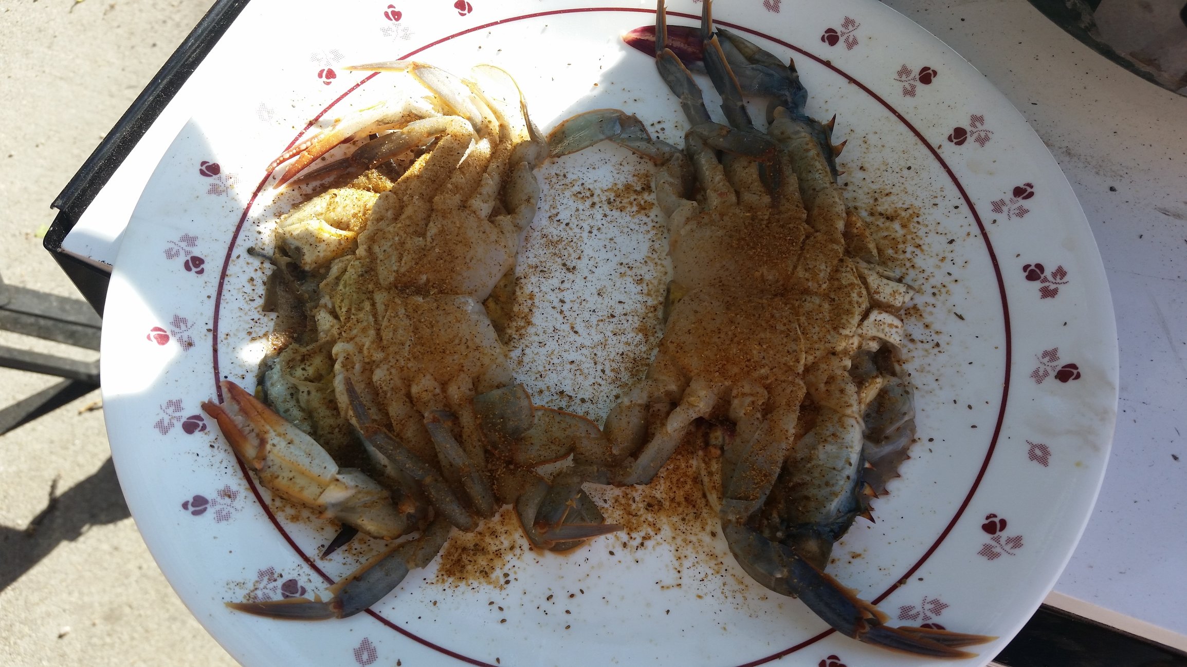 Soft shell crab. Dusting of Old Bay and grilled direct. Sorry for only having a "before" picture. Things were moving fast! It was good but I think I prefer them fried.