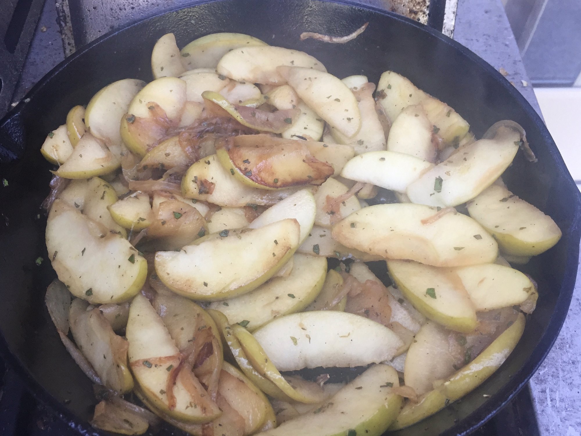Moved the CI over to the sideburner on the gasser for the onions and Granny Smith Apples