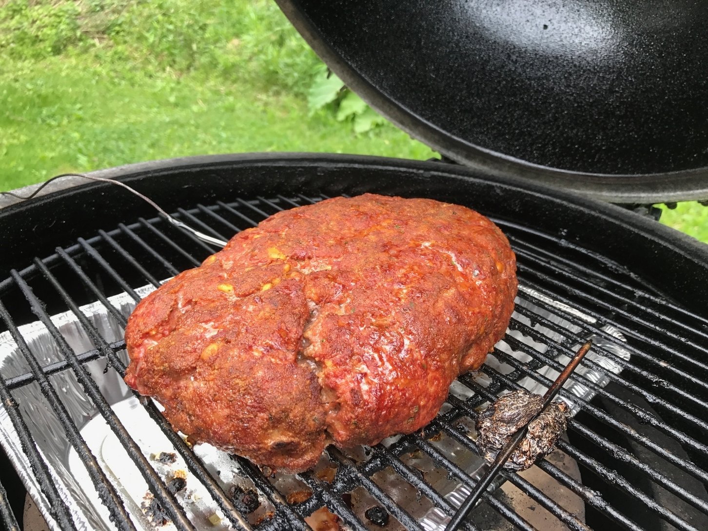 A few days or maybe a week or so ago, I saw some meatloaf posts and pictures.  It made me need to do a meatloaf.  The weather forecast was wrong (again), so I had time to do one for lunch before some thunderstorms.  My meatloaf recipe is much like everyone else's where it is by look and feel with nothing measured.  I did add crushed up goldfish crackers to this one since we had some.  First time trying them in a meatloaf.  I thought they added a nice touch.  The only other thing I really think adds a lot to the flavor of my meatloaves is this BBQ sauce (they make some good beer, too).  Other than that, 285 grid for about 1.5 hours and mesquite chunks.  BGE meatloaf is next level stuff.  Thanks for looking.