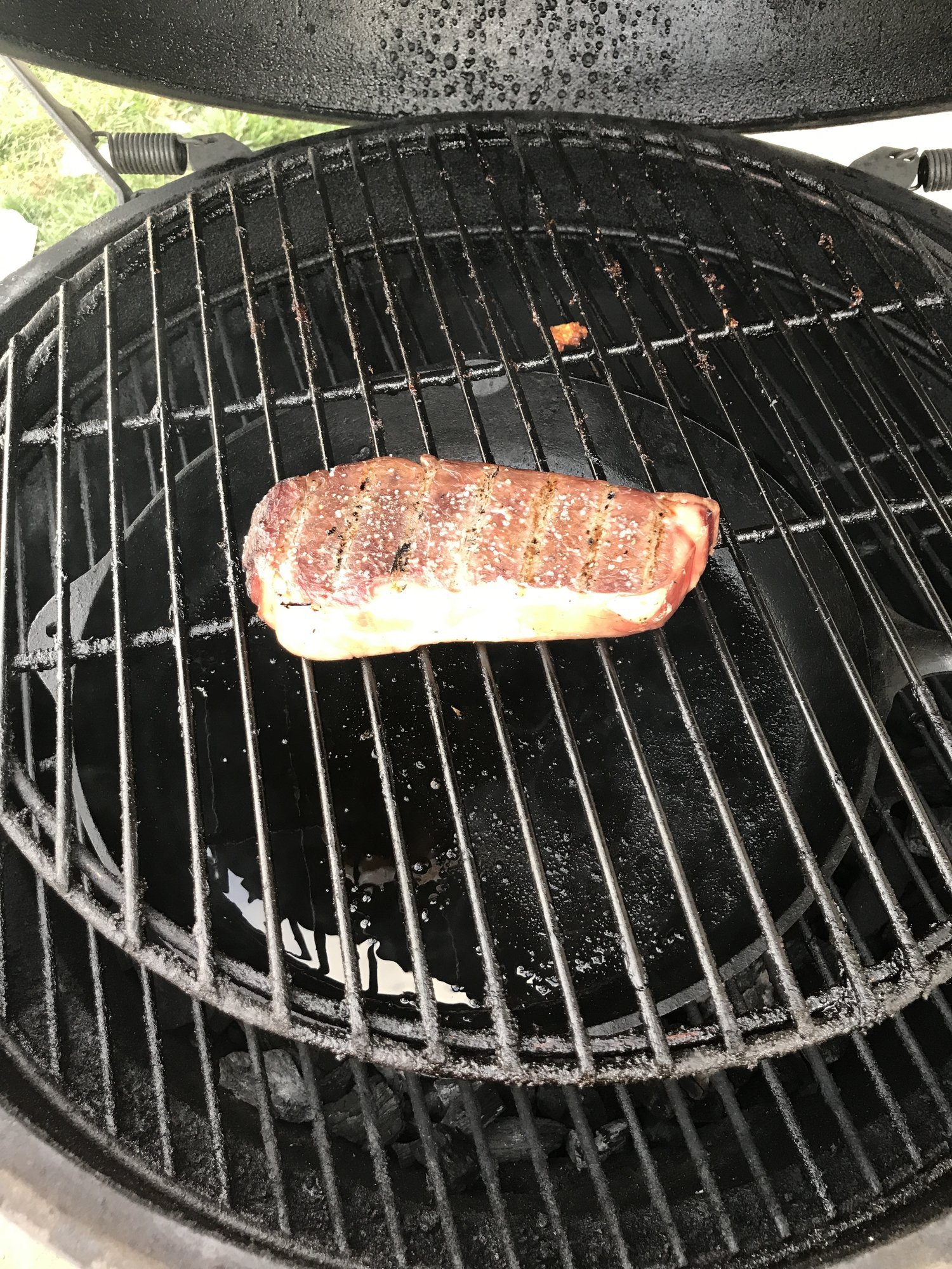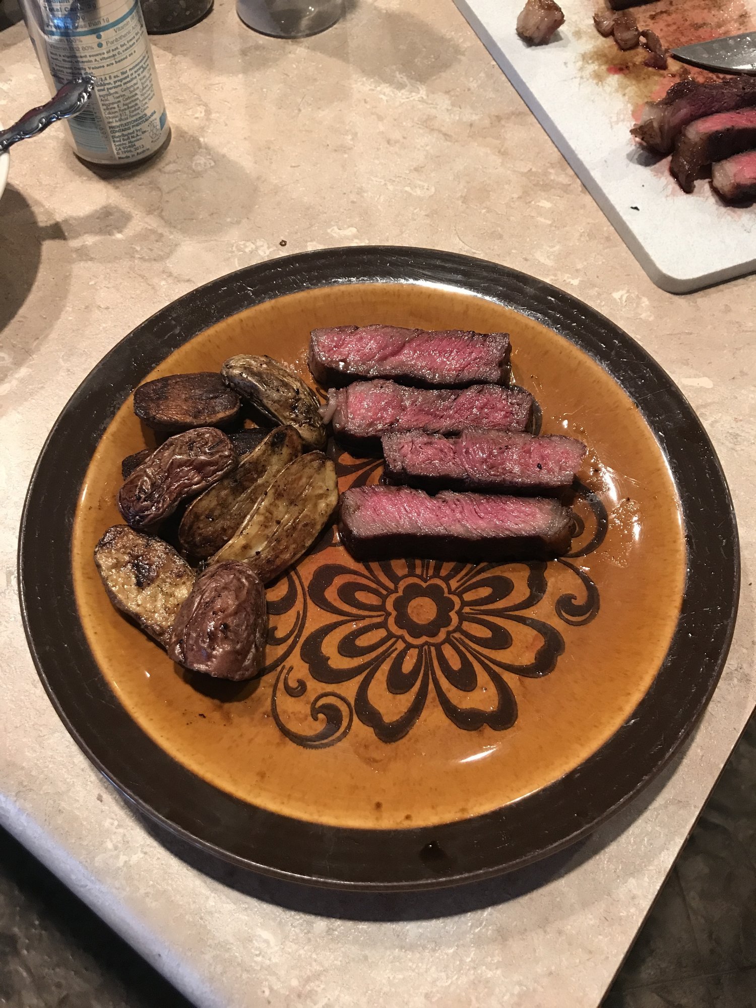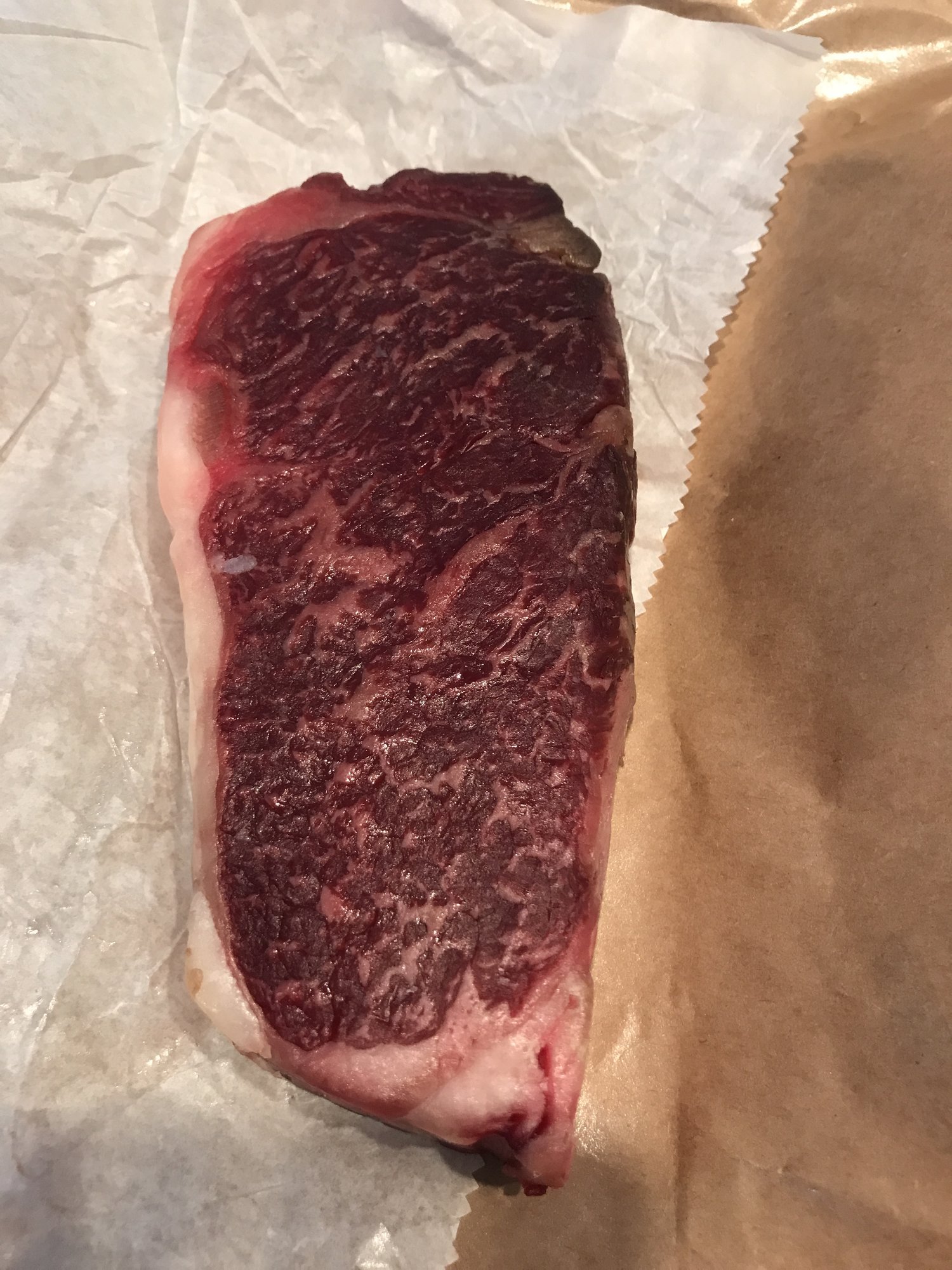 The lady of the house and kids are in Chicago for the weekend so I decided to treat myself to an early Father's Day gift. Picked up a 28 day dry aged wagyu strip at the market. Decided on some fingerling potatoes done in the searing skillet as a side. Seasoned the potatoes with evo, salt and pepper. Steak got just salt and pepper. Potatoes and a blue cheese chicken bomb went on 30 minutes before the steak. Even though the steak was only a little over an inch thick(I asked for a thicker cut but, the c team working was unwilling to ablige) I went with a reverse finishing in the cast iron. Steak only took 8 minutes at 375 to get to an internal of 115. Thanks for looking.