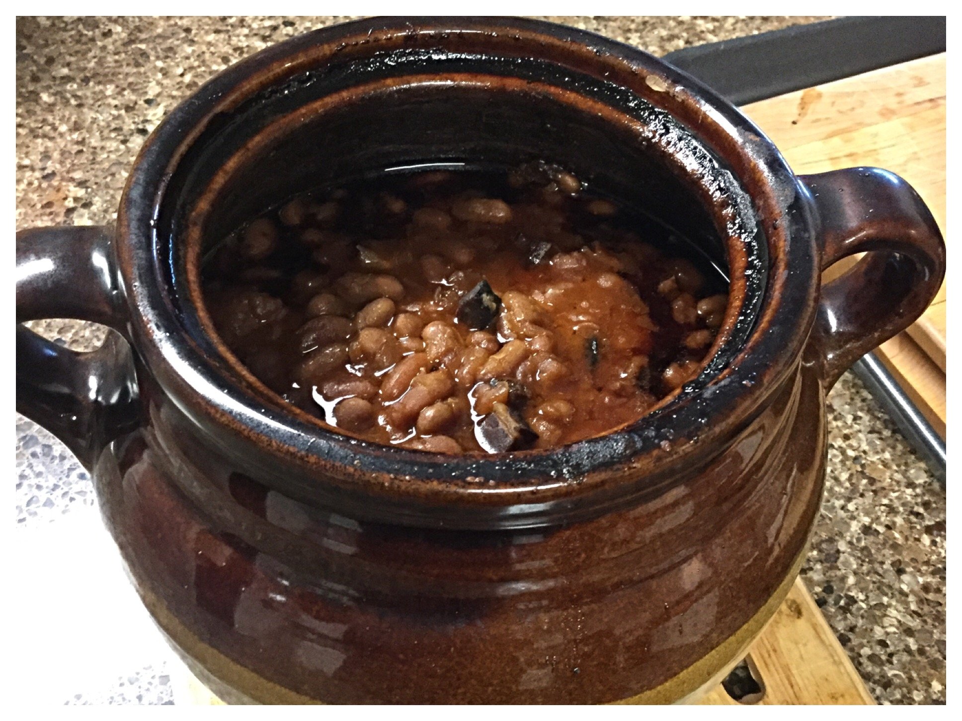 This is for fun. I baked these beans with retained heat in the wood fired oven. I simply slid the crock in the oven about 9:00AM and then 8 hours later there was magical goodness.
