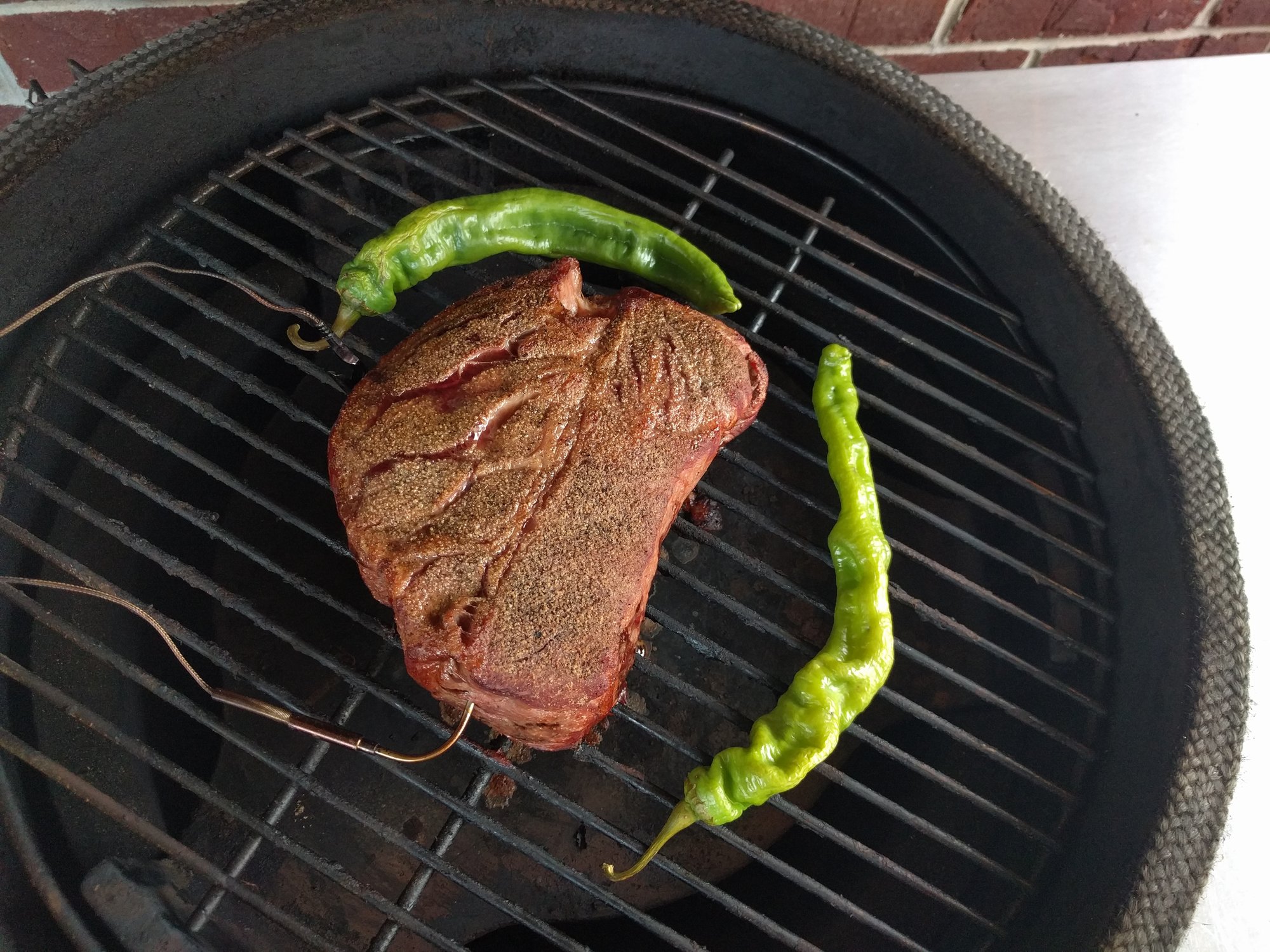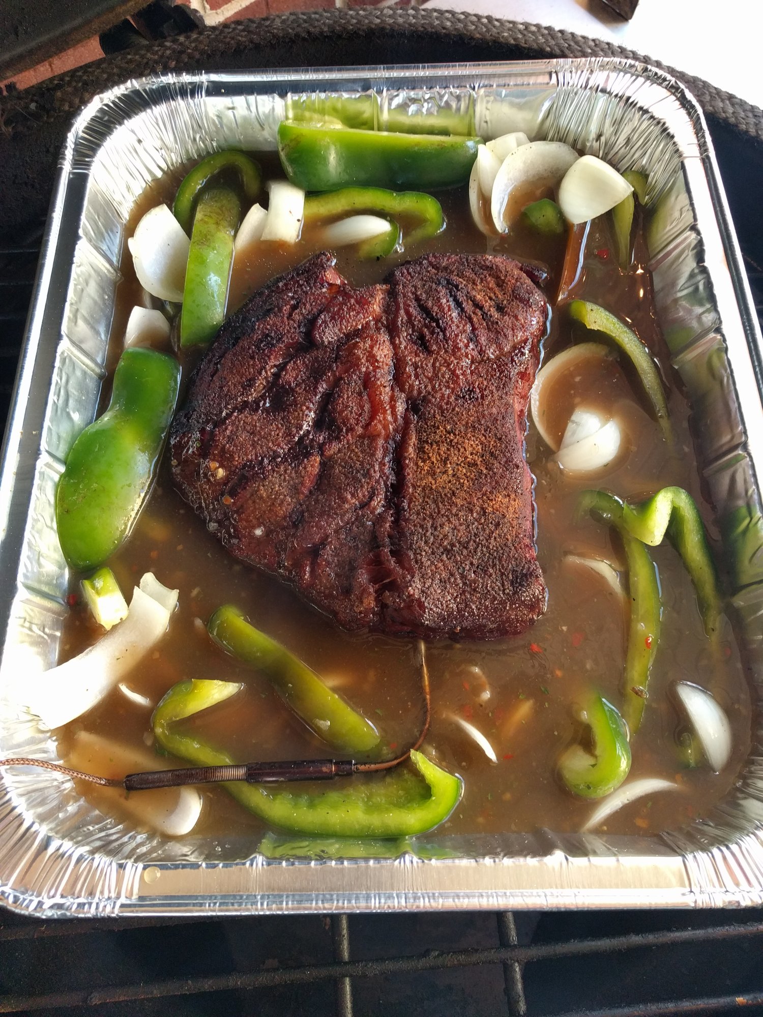 So my elf sent me italian beef seasoning packet so I mixed per the instructions but trying on the egg. Once the meet hit 165 internal I put it in the pan with peppers and onions then back on the egg. @milesvdustin thank you for the awesome seasoning pack. It's rolling at 300 now due to delays at my in-laws pool earlier today. Added some long hots for the Sammie's later. Hopefully this thing gets done before midnight.  :s